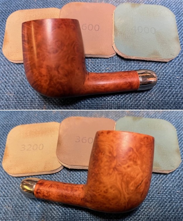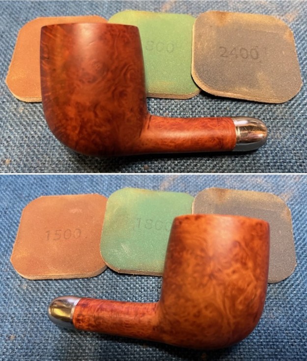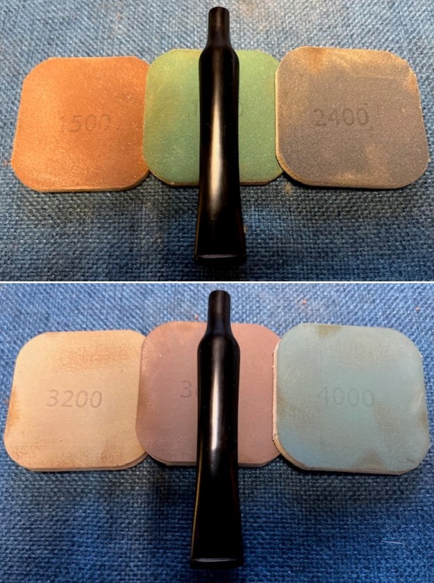 I polished the vulcanite stem with micromesh sanding pads – 1500-12000 grit pads. I wiped it down with a damp cloth after each sanding pad. I used Before & After Pipe Polish – both Fine and Extra Fine to further polish the stem.