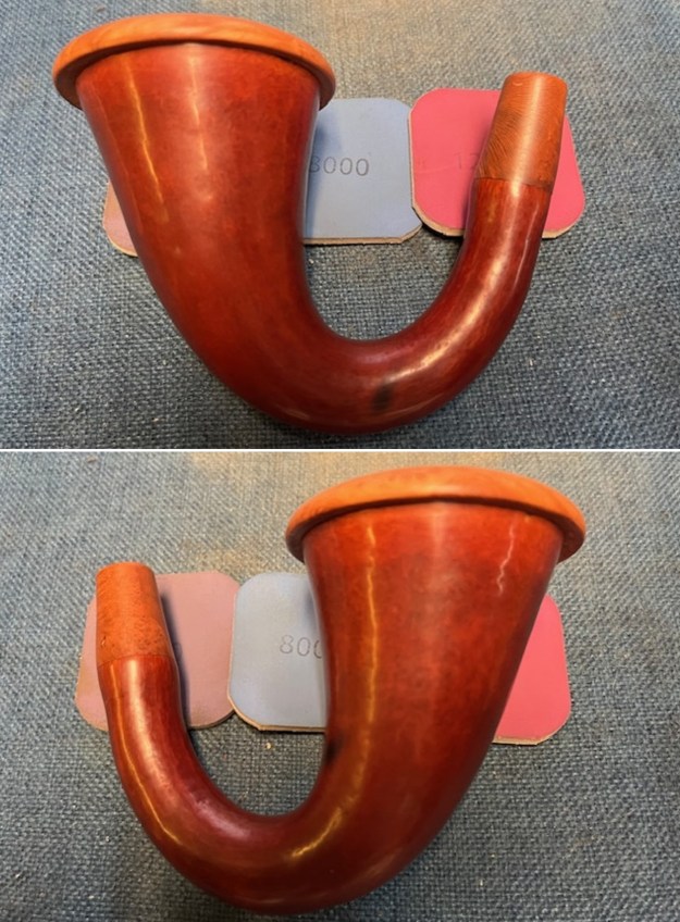 I polished the Lucite with micromesh sanding pads – 1500-12000 grit pads. I wiped it down with a damp cloth after each sanding pad. I used Before & After Pipe Polish – both Fine and Extra Fine to further polish the stem. It really took on a shine and once buffed it would look amazing.