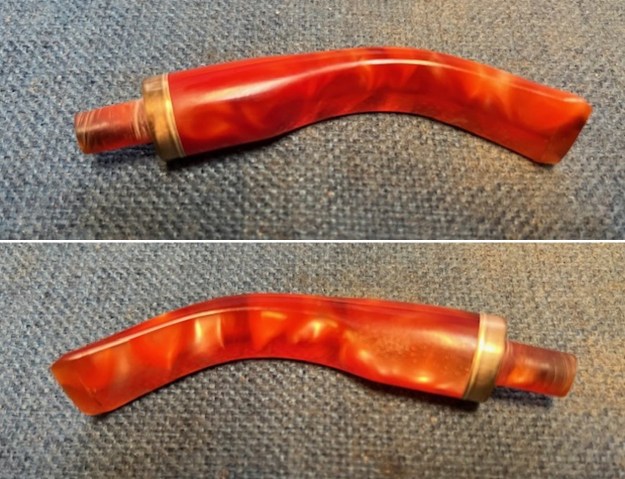 One of the things I enjoy doing is putting together varied and assorted pipe parts and crafting a pipe. Sometime the pieces are sitting here for a long time waiting for either the inspiration or the proper parts. This old calabash gourd sitting here for a few years now. It was cleaned and did not have either a cork gasket to hold a bowl or stem to fit the briar shank extension on the shank end. It just languished in a box of old bowls that I have here. (They say confession is good for the soul so I will tell you that box is full of probably over 100 bowls. Did I tell you I have a problem throwing pipe parts away?). In this case I did not have any meerschaum or porcelain cups that would fit the size of the gourd and I had not bothered to look through my stems to find one that fit the shank. So the old gourd just sat here waiting. In October I visited a fellow pipe repairer in Vancouver, Washington, USA and he gifted me a lot of pipe parts. Included in the mix were two turned wooden cups for a gourd calabash and one porcelain cup. Yesterday I remembered them and took them out to try. Like Goldilocks in the childhood fairy tale checking out the beds at the tree bears house I tried each one. The “baby bear” porcelain cup was far too small for the gourd and the “papa bear” cup was too large. But like Goldilocks found, the “mama bear” middle wooden cup one fit just right! While I was at it I also pulled an acrylic stem out from my collection of stems that I thought would work with this pipe. Now it was time to put it all together. Here is a picture of the parts. I decided to work on the gourd portion of the pipe first. I cut some cork to fit a gasket in the inset area around the top of the calabash. I used a white all-purpose glue and coated the gourd edge and pressed the cork against it. It took a bit of holding it in place to get the glue to harden. But it worked well. Once the glue cured is used a knife blade to trim the cork flush with the top of the gourd. I smoothed it out with a Dremel and sanding drum to make for a snug fit for the cup to the cork but not too snug and have it pull away.I greased the cork with Vaseline Petroleum Jelly. I worked it into the surface of the cork before I called it a night last evening and then once again this morning. I find that it softens the cork and make it more pliable when the bowl is pressed into place.While the cork/glue was curing I drilled the airway in the bottom of the wooden insert. It was undrilled. I marked the centre and then drilled the airway in the bottom of the cup. I drilled it with a cordless drill and a small bit from the inside of the bowl rather than the outside. I pressed it against a piece of wood and drilled it through. My concern in doing it from the outside was the pressure on the cup and the potential of cracking it.I started sanding the wood cup (which I think is Maple) with 320-3500 grit sanding pads. I wiped the bowl down with a damp cloth after each sanding pad to remove the sanding debris.I polished the bowl with micromesh sanding pads – dry sanding with 1500-12000 grit pads. I wiped the bowl down after each sanding pad with a damp cloth to remove the debris. I worked on the inner edge of the bowl to smooth that out and the slight bevel on the inner edge. It really began to take on a rich glow. With cup polished and the cork gasket set in the gourd I pressed the cup into the gourd calabash and it went in snugly and looked great. I took photos of the fit to show you all. I sanded the gourd with 320-1500 grit sanding pads to smooth out the nicks in the surface and minimize the two dark spots on the curve of the shank. I also sanded the briar shank extension to reveal the grain. It looked better and the rich grain began to shine through. I polished the gourd with micromesh sanding pads – dry sanding with 1500-12000 sanding pads. I wiped the gourd down with a damp cloth after each sanding pad to remove the sanding debris and dust. It really began to take on a shine. I rubbed the gourd and the maple cup down with Before & After Restoration Balm. I worked it into the surface with my fingertips. The product works to clean, enliven and preserve the pipe. I let it sit for 10 minutes then I buffed it with a cotton cloth to deepen the shine. The gourd came alive with the balm. I set the bowl aside and turned my attention to the stem I had chosen. The acrylic orange/amber stem would look good once I finished.The fit of the stem to the shank was quite good. The briar shank extension on the gourd is canted slightly and the shank extension follows the angles. With that the stem fit tight against the left side of the shank but not on the right side. I had an idea of fitting a brass band/cap on the end of the stem to compensate for the angels on the shank end. It fit very well and the band/cap was snug on the stem. I sanded the tooth chatter on both sides of the stem with 320-3500 grit sanding pads to smooth it out and blend it into the surface of the acrylic. I started the polishing of the brass stem cap on the shank end at the same time. It started looking very good.I polished the Lucite with micromesh sanding pads – 1500-12000 grit pads. I wiped it down with a damp cloth after each sanding pad. I used Before & After Pipe Polish – both Fine and Extra Fine to further polish the stem. It really took on a shine and once buffed it would look amazing. I carefully polished the parts – the cup, the gourd and the stem with Blue Diamond on the buffing wheel. I gave each piece of the pipe multiple coats of Carnauba Wax and buffed it with a clean buffing pad. I hand buffed the parts with a microfibre cloth. Once it was finished I put the parts back together. The Maple cup looked beautiful with the darkened gourd calabash. The polished briar shank extension was deeply shined. The brass stem adornment went well with the orange acrylic stem. The large Gourd Calabash with its wooden cup is beautiful. The dimensions of the pipe a