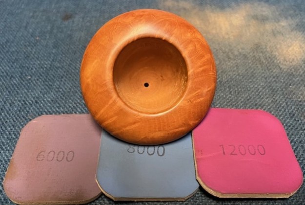 I started sanding the wood cup (which I think is Maple) with 320-3500 grit sanding pads. I wiped the bowl down with a damp cloth after each sanding pad to remove the sanding debris.