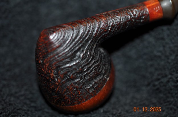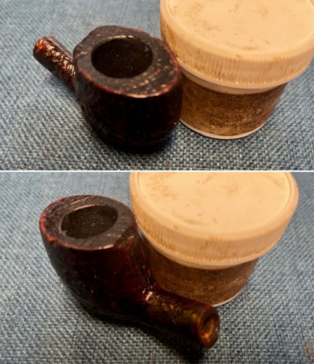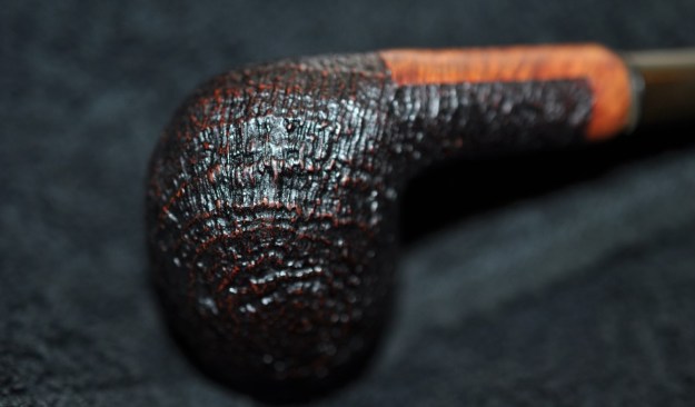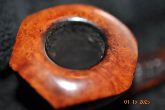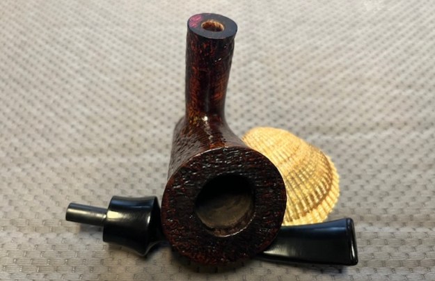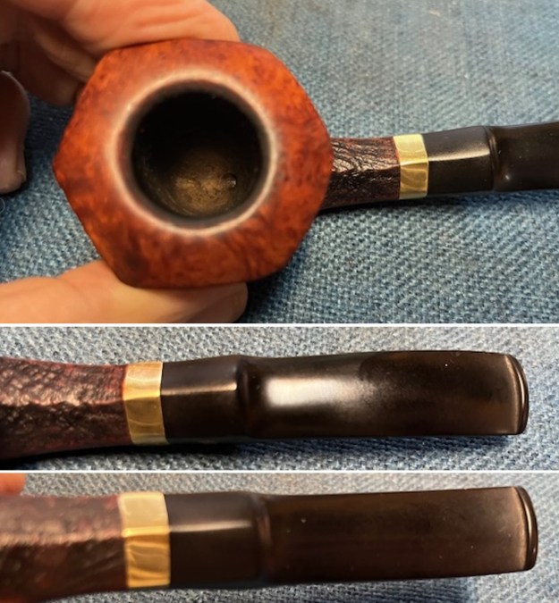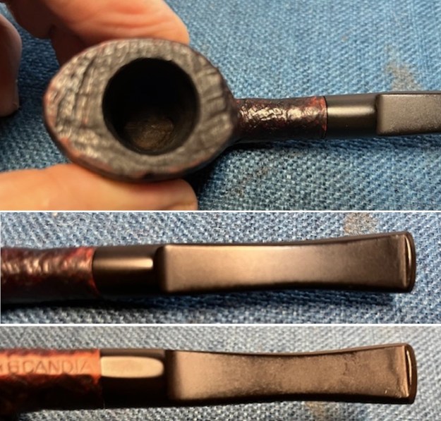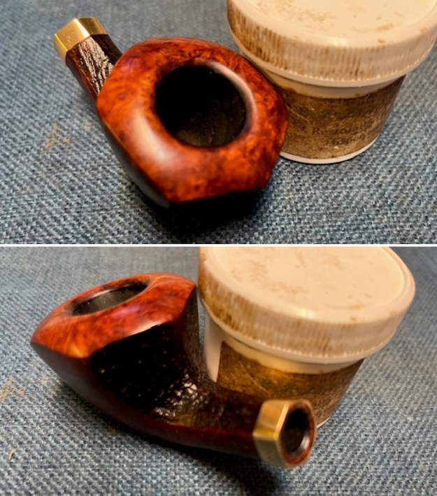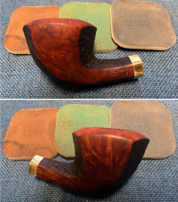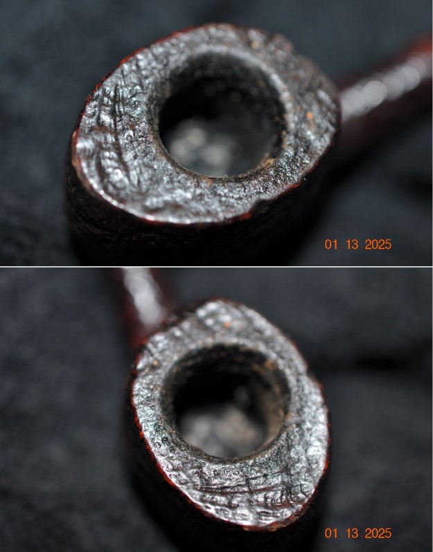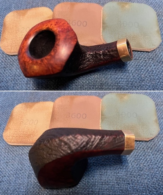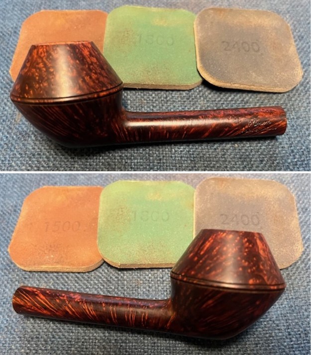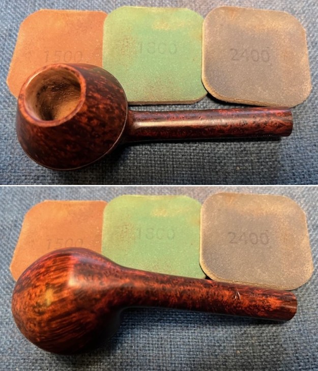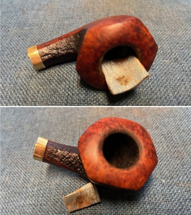 The damage to the rim is significant. In order to lessen the burns and nicks on the rim, I ‘topped’ the pipe – that is to say, I gently and evenly sanded the rim on a piece of 220-grit sandpaper. This effectively minimizes the damage, without altering the look of the pipe.
