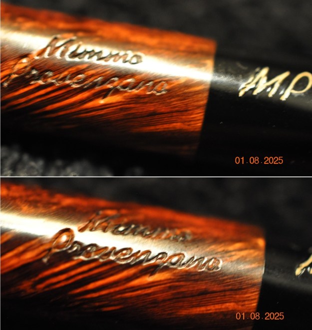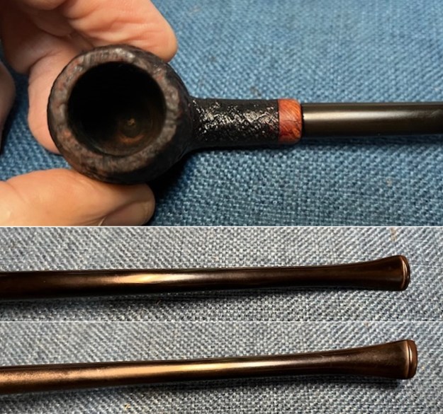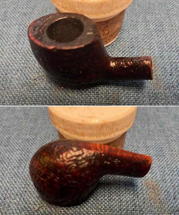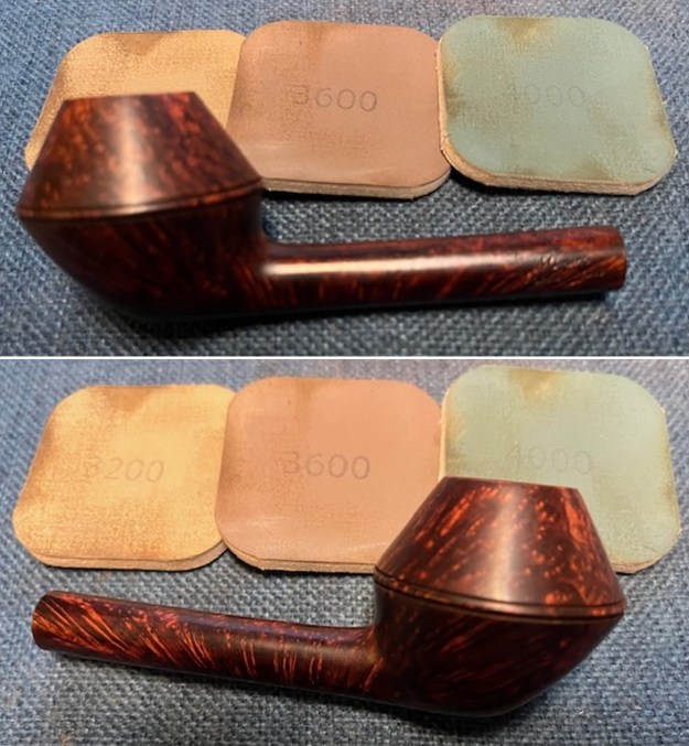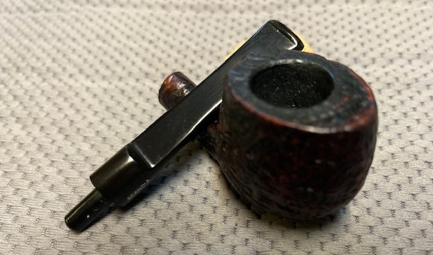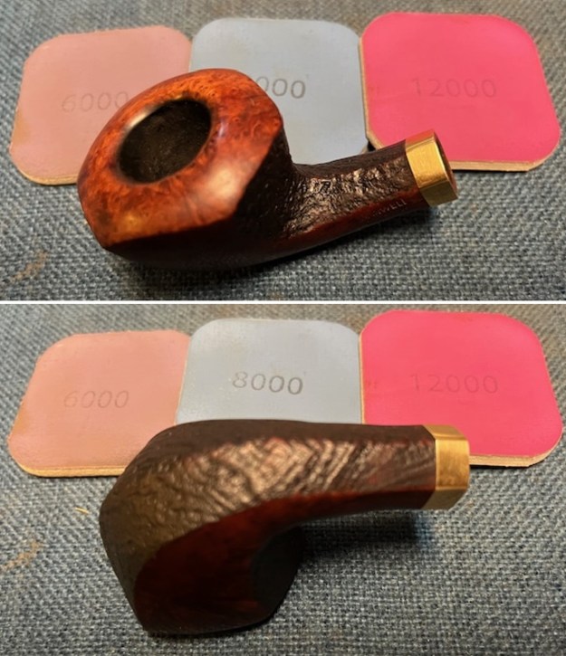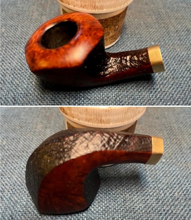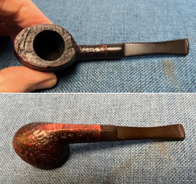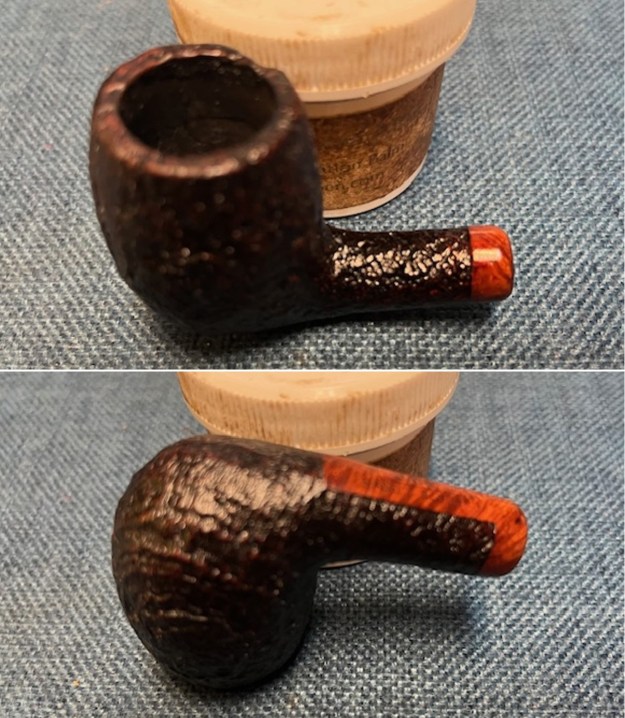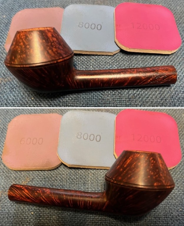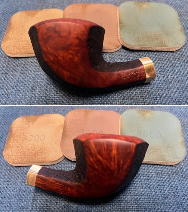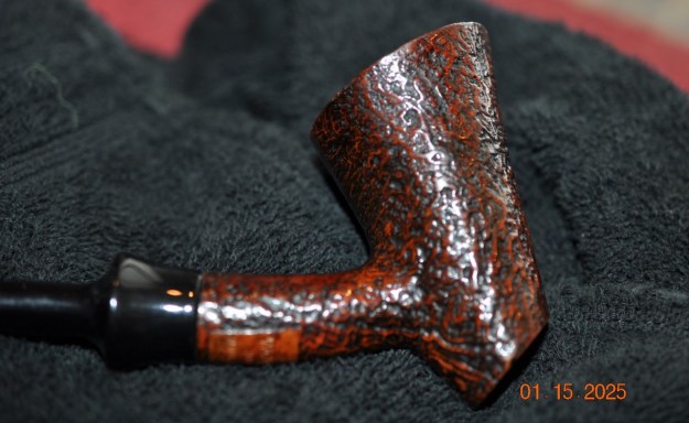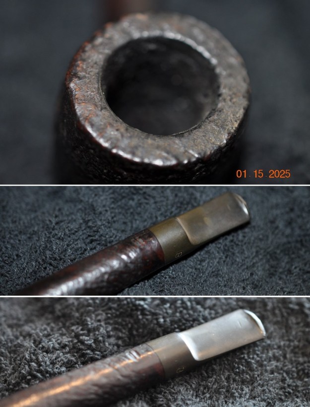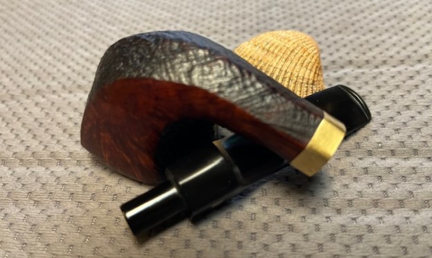 The damage to the rim is significant. In order to lessen the burns and nicks on the rim, I ‘topped’ the pipe – that is to say, I gently and evenly sanded the rim on a piece of 220-grit sandpaper. This effectively minimizes the damage, without altering the look of the pipe.