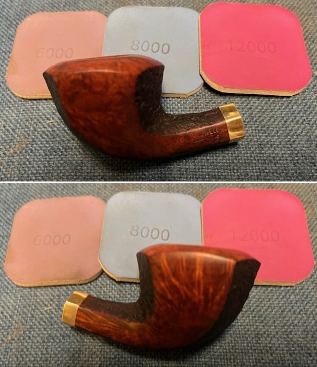I took a solid wooden sphere, wrapped a piece of 220-grit sandpaper around it, and sanded the inner edge of the rim. This achieves two things: first, it removes some of the burn marks; and second (and more importantly), the circular shape and motion of the sphere gradually returns the edge to a perfect circle. I then used all nine micromesh pads (1,500 through 12,000 grit) on the outside of the stummel to finish it off. This sanding minimizes flaws in the briar and provides a beautiful smoothness to the wood. I rubbed some Before & After Restoration Balm into the briar and let it sit for 20 minutes or so. The balm moisturizes the wood and gives a beautiful depth to the briar. I then buffed it with a microfibre cloth.