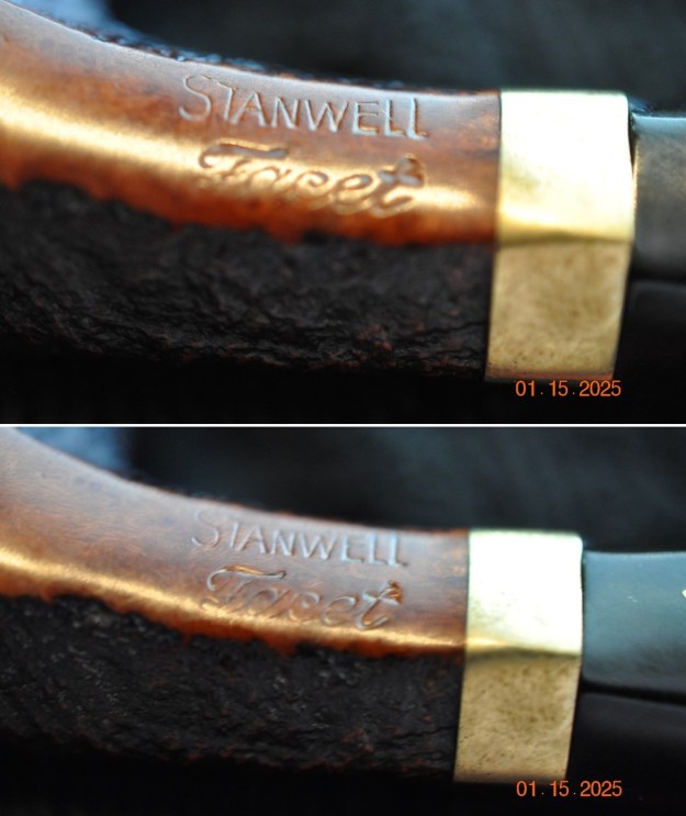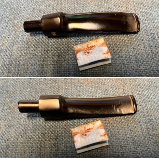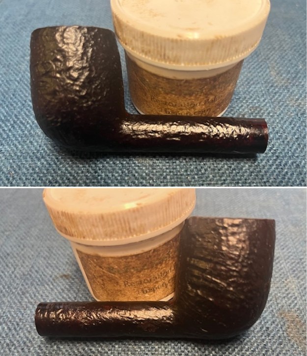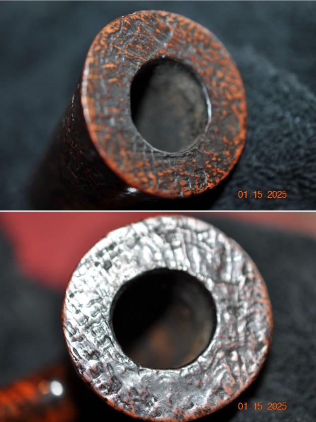 Some of the burn remained on the rim, so I took some crystalized oxalic acid and dissolved it in warm water. I took some cotton swaps, dipped in the solution, and rubbed the burned spot vigorously. Some of the burn was removed, but, unfortunately, some will always remain as part of this pipe’s history.