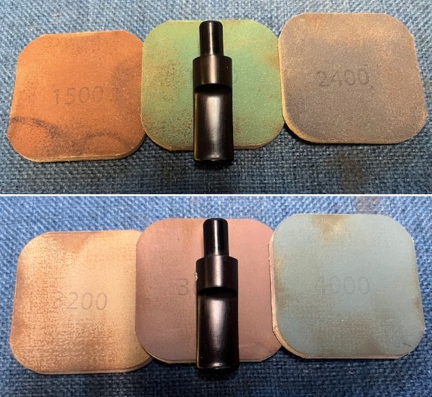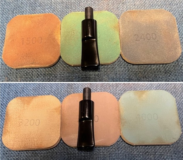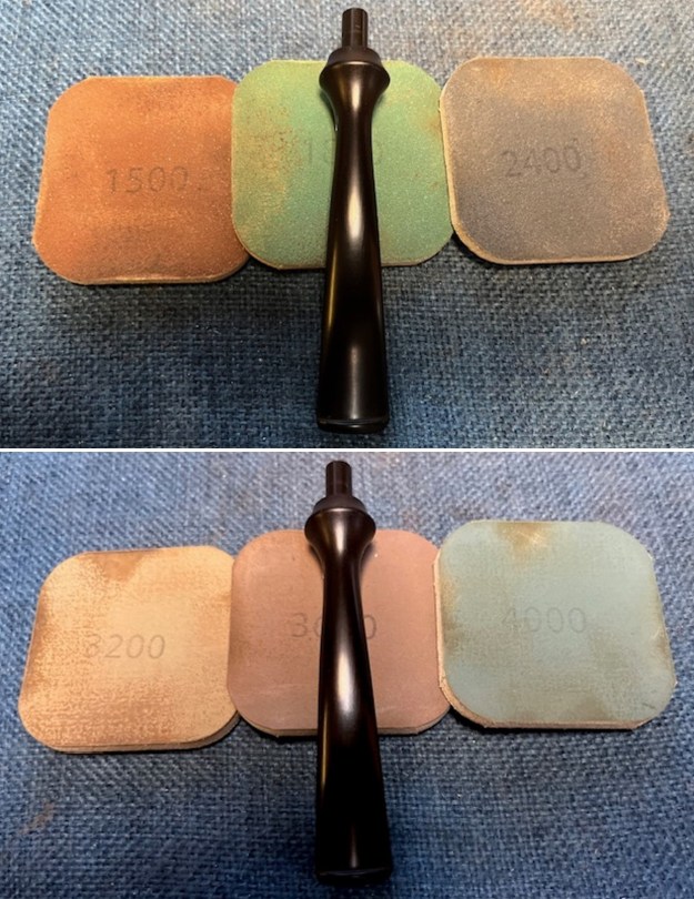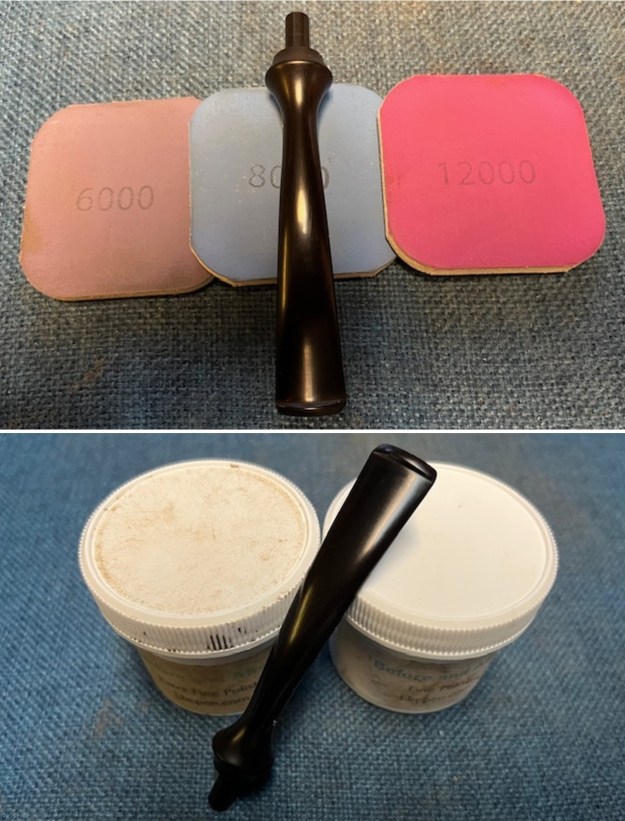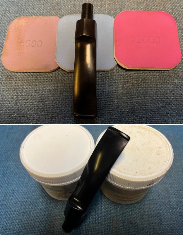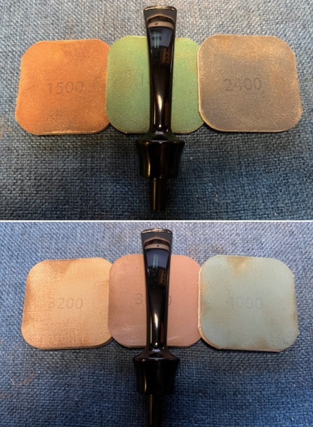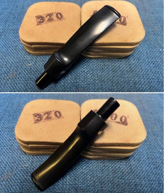I used all nine of the micromesh sanding pads (1,500 through 12,000 grit) to sand out flaws, even out the vulcanite, and provide gentle polishing of the finished surface. I also applied pipe-stem oil while using the last five micromesh pads. There was a wonderful, deep black shine to the stem when I was done.