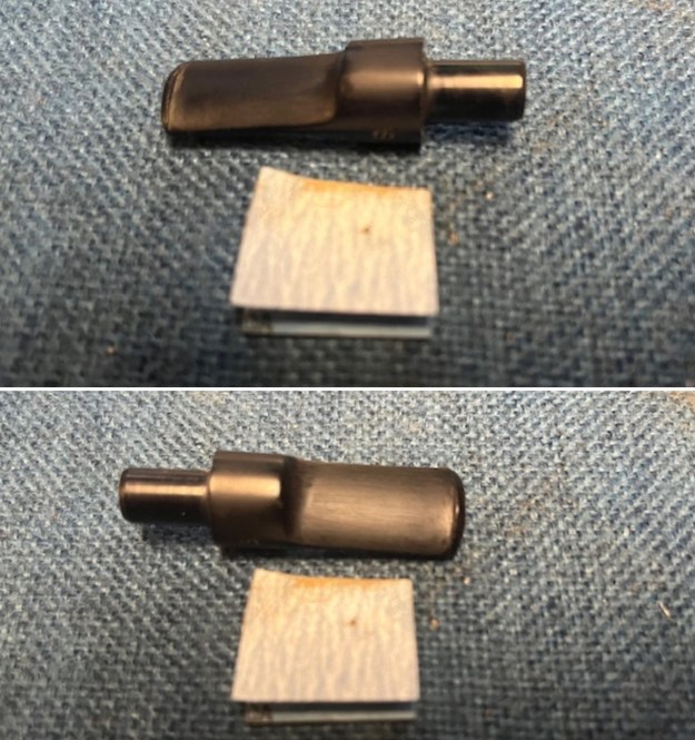The goal of the next step is the removal (or minimization) of oxidation. Going to my sink, I used cream cleanser, cotton rounds, and a toothbrush, and scoured the stem to remove as much surface oxidation as possible. As the photos show, the result is a hideous brownish mess – but better off the stem than on it.