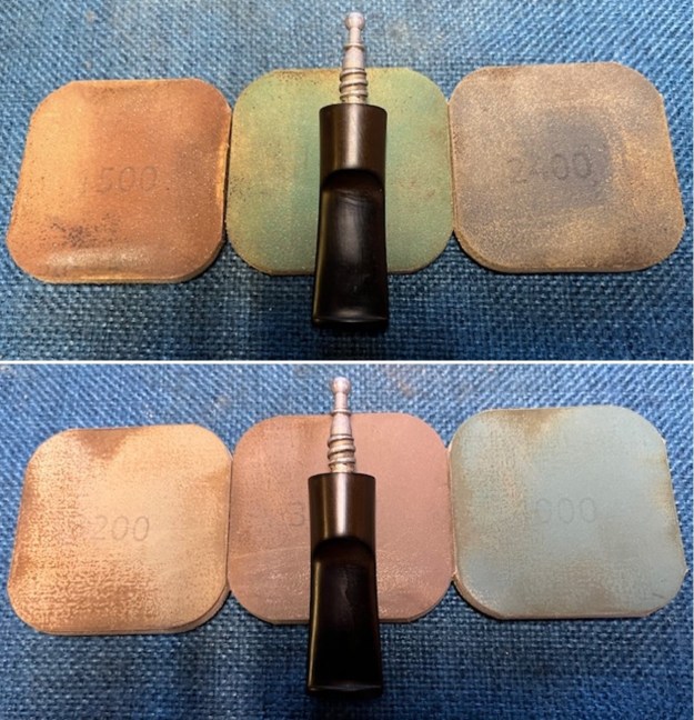 The penultimate step for the stem is sanding. First, with my set of needle files, I reduce the bulk of the cyanoacrylate repairs. I want to remove the excess adhesive as near to the surface as possible, without cutting into the vulcanite. Following that, I use all nine of the micromesh sanding pads (1,500 through 12,000 grit) to sand out flaws, even out the vulcanite, and provide gentle polishing of the finished surface. I also apply pipe-stem oil while using the last five micromesh pads. There was a wonderful, deep black shine to the stem when I was done.