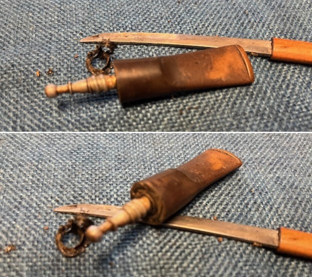 Let’s get working. As mentioned, the stem’s calcification was quite substantial. I used an old butter knife and gently scraped some of the thicker accretion off. Doing this now helps later in removing the oxidation.