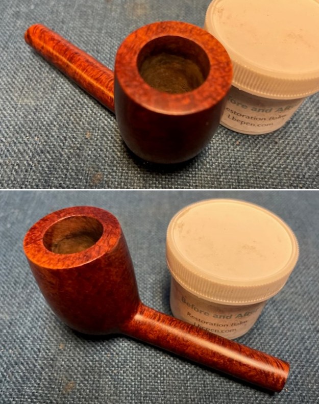 The exterior of the bowl look better after sanding. I worked some Before & After Restoration Balm into the briar with my finger tips. I let it sit on the bowl for 10 minutes and then buffed it off with a paper towel and soft cloth. The product is a great addition to the restoration work. It enlivens, enriches and protects the briar while giving it a deep glow. It is a product I use on every pipe I restore.