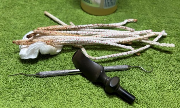 I sanded the stem with 320-3500 grit sanding pads to remove the tooth marks and chatter against the button edge and sand the logo. It worked well on the tooth marks but did little on the logo on the stem top.