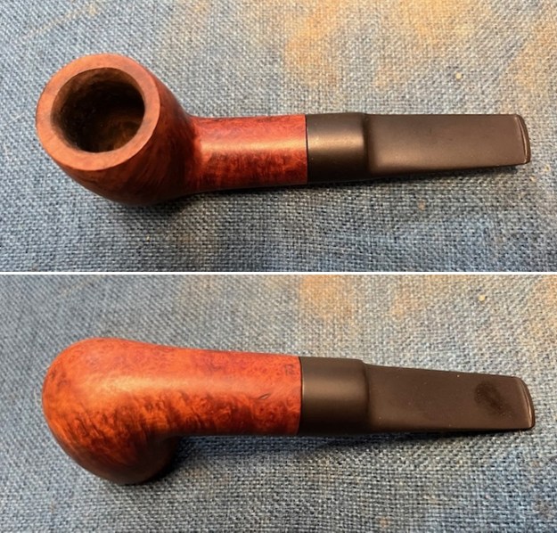 The next pipe I have chosen is a beautifully grained and smooth finished Billiard with a slightly bent acrylic taper stem. It came to us on August 22, 2024 from a friend in Barrington, Rhode Island, USA. The contrast of the brown stains makes the grain stand out. It was stamped left side of the shank and read il ceppo. On the underside it is stamped E3702 [over] Made in Italy [arched over] In Italy (underlined). Next to the shank/stem junction it reads 3 in a triangle. The pipe was quite clean with some slight darkening inside the bowl. It had obviously been reamed recently. The bowl was clean and the smooth rim top was dirty but free of lava. The black acrylic saddle stem was in good condition other than being a bit dirty. The stem surface was free of chatter on both sides of the stem ahead of the button. The il ceppo “C” logo on the top of the stem was in good shape. Jeff took photos of the pipe before his cleanup work. They tell the story and give a glimpse of the pipe.