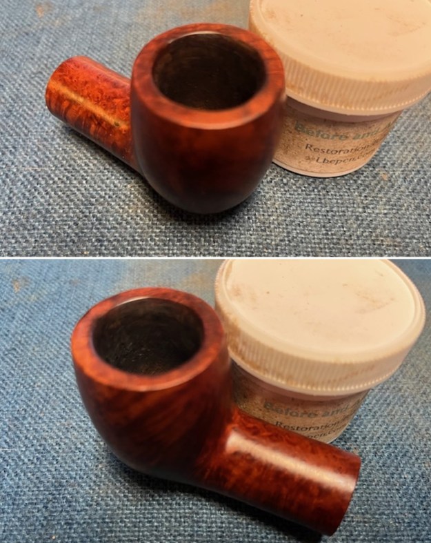I worked some Before & After Restoration Balm into the surface of the briar with my fingertips to clean, enliven and protect the briar. I let the balm sit for 15 minutes and then buffed with a cotton cloth to raise the shine. The photos show the bowl at this point in the restoration process.