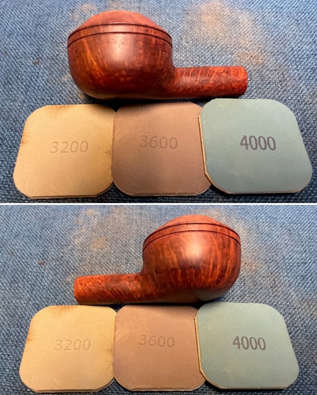 I sanded the outside of the bowl and the rim top with 320-3500 grit sanding pads. I wiped the bowl down with a damp cloth after each sanding pad. The repair blended into the surrounding briar. There was some darkening around the outer edge of the patch.