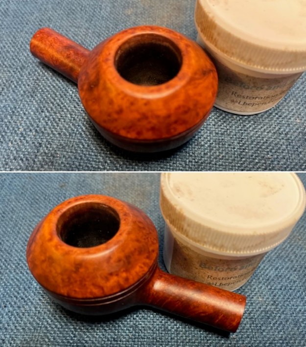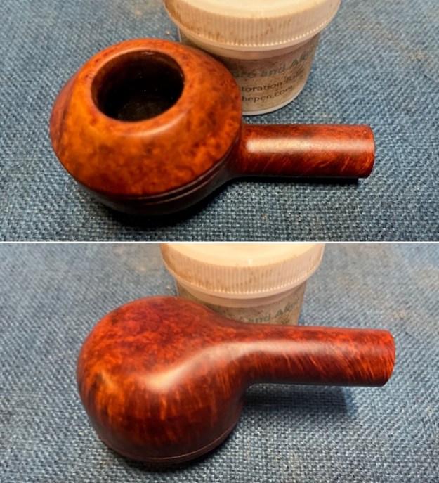 The exterior of the bowl looks better after polishing. I worked some Before & After Restoration Balm into the briar with my finger tips. I let it sit on the bowl for 10 minutes and then buffed it off with a paper towel and soft cloth. The product is a great addition to the restoration work. It enlivens, enriches and protects the briar while giving it a deep glow. It is a product I use on every pipe I restore.