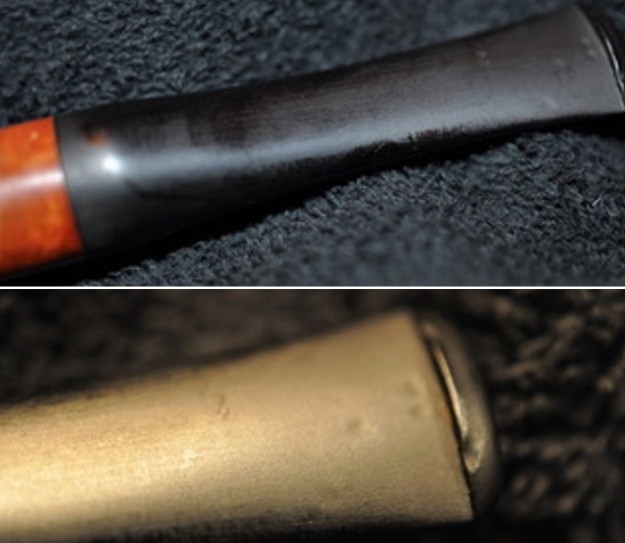 I “painted” the surface of the stem with the flame of a lighter to lift the tooth marks. I was able to lift some of them. I filled in the few that remained with a rubberized black CA glue. Once it cured I use a small flat file to smooth out the repairs on the stem surface. I followed that up by sanding it with a folded 220 grit sandpaper.