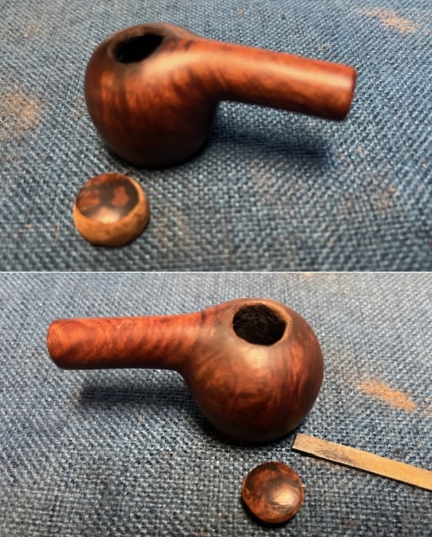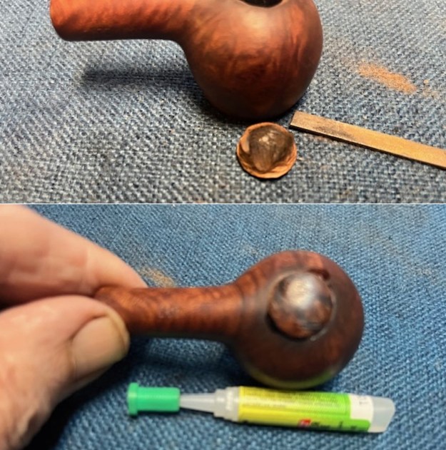 I used a Dremel and sanding drum as well as several files to shape of the bottom of the plug to the same size as the hole in the bottom. Once it was shaped I fit it to the hold in the bottom. I glued it in place with clear CA glue. I filled in the gaps around the plug with briar dust and super glue. When the glue cured I sanded the repair smooth with a folded piece of 220 grit sandpaper.