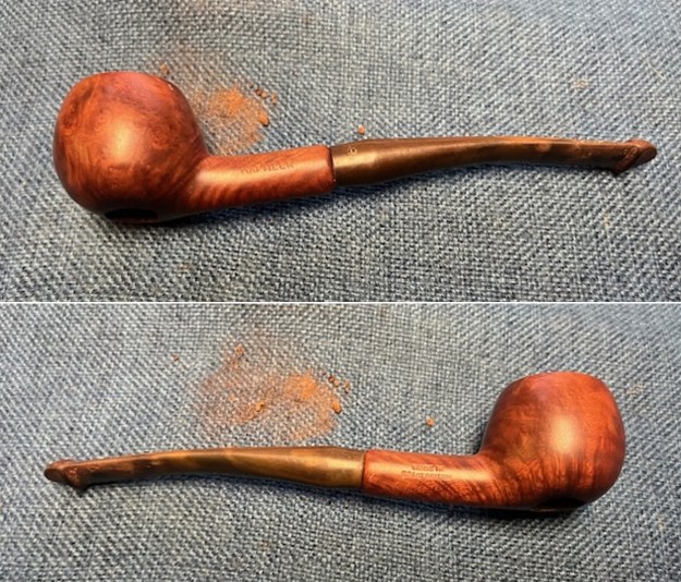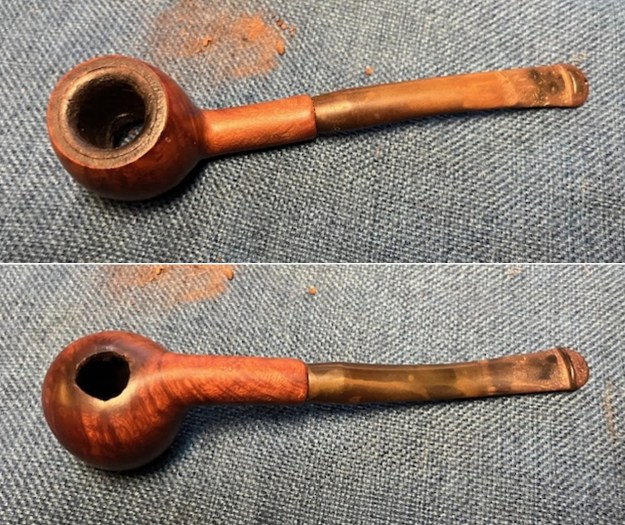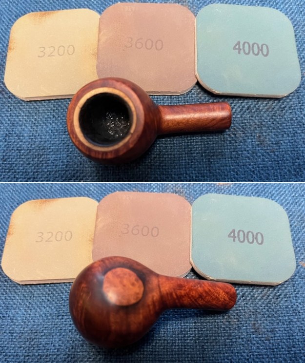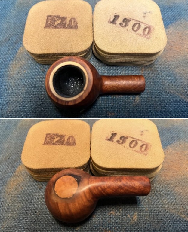 I sanded the outside of the bowl and the rim top with 320-3500 grit sanding pads. I wiped the bowl down with a damp cloth after each sanding pad. The repair blended into the surrounding briar. There was some darkening around the outer edge of the patch.