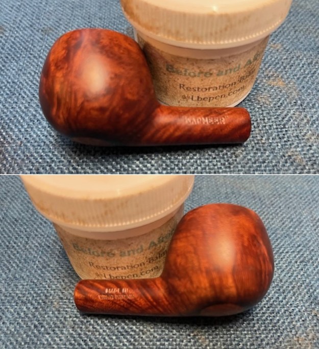 The exterior of the bowl looks better after polishing. I worked some Before & After Restoration Balm into the briar with my finger tips. I let it sit on the bowl for 10 minutes and then buffed it off with a paper towel and soft cloth. The product is a great addition to the restoration work. It enlivens, enriches and protects the briar while giving it a deep glow. It is a product I use on every pipe I restore.