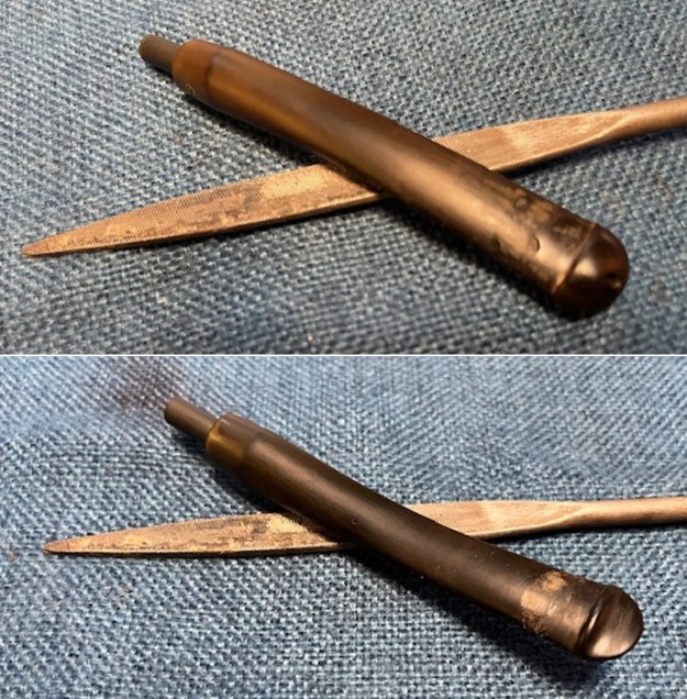 I “painted” the surface of the stem with the flame of a lighter to lift the tooth marks. I was able to lift some of them. I filled in the few that remained with a rubberized black CA glue. Once it cured I use a small flat file to smooth out the repairs on the stem surface. I followed that up by sanding it with a folded 220 grit sandpaper.