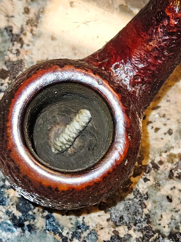 I used a paper towel dipped in a diluted solution of Fieblings Medium Brown stain to refresh the briar. It was lightly buffed with carnuba wax to revive the shine.