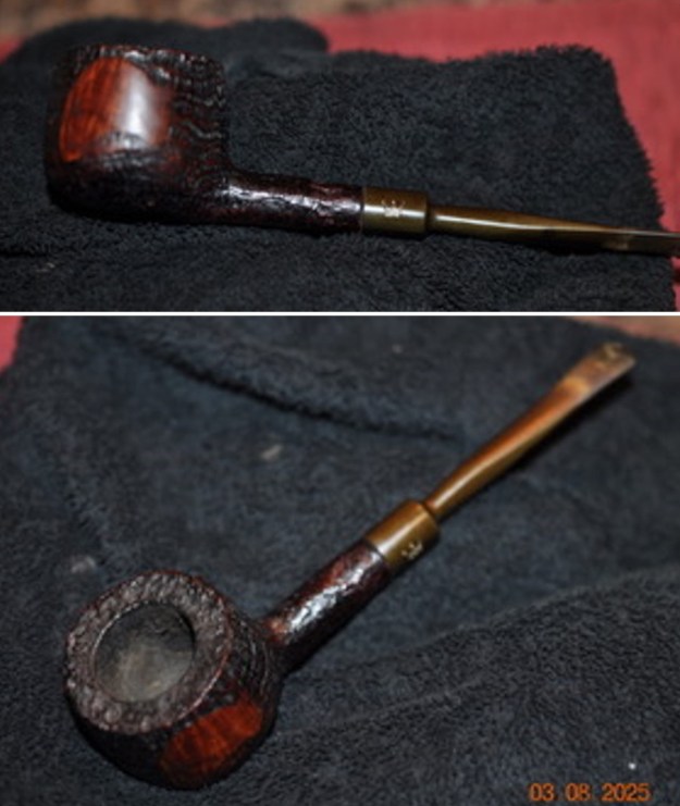 The next pipe on the table is one that we picked up in an estate lot from a seller in Sacramento, California, USA on 09/03/2024. The sandblast finish with two smooth panels looking like a Stanwell style pipe is what caught our eye. It is stamped on the underside of the shank and reads Royal Danish [over] Made in Denmark to the right it is stamped with a shape number 989. That is followed by R. It has a classic sandblast finish and the smooth panels on the sides of the bowl are a stark contrast to vulcanite, faux military taper stem. There is Royal Danish Crown logo on the right side of the stem and looks to be in good condition. The seller sent the following photo of the pipes that we purchased. The pipe I am working on is the one on the top of the right column in the photo below.