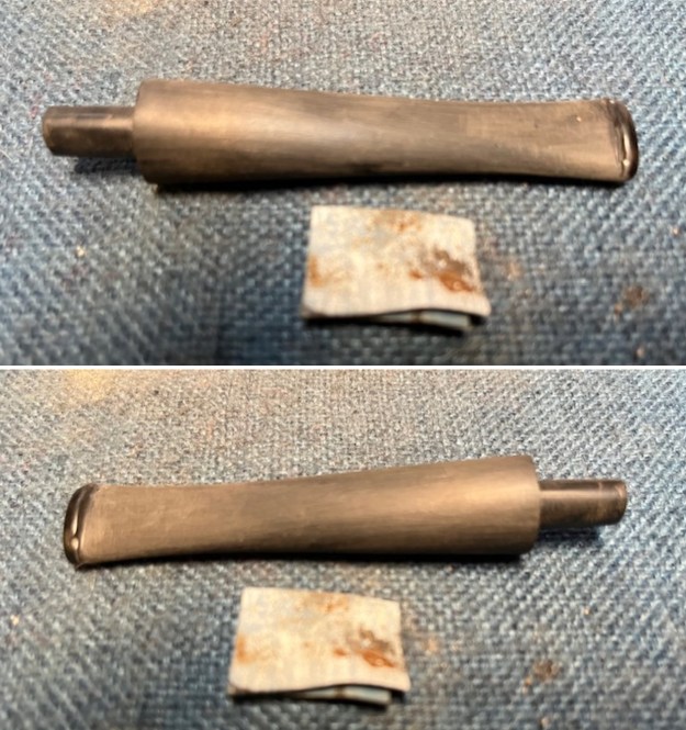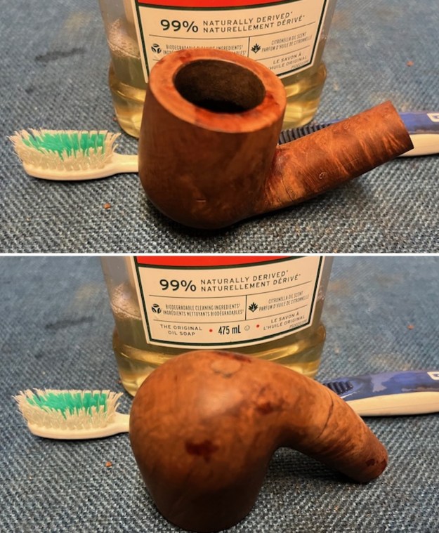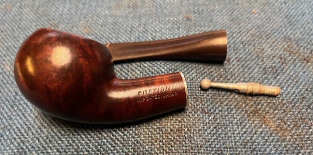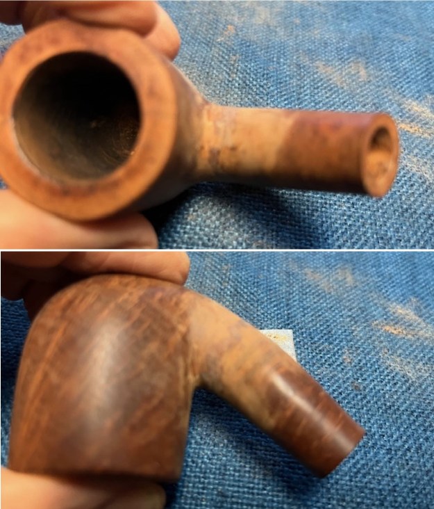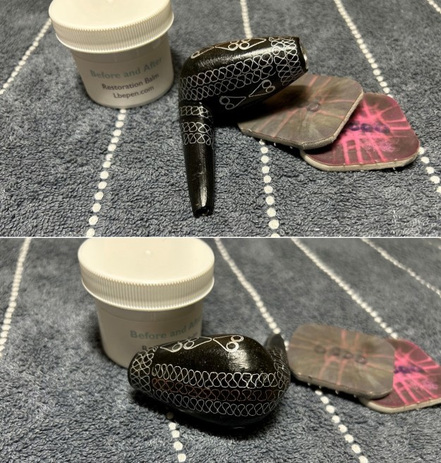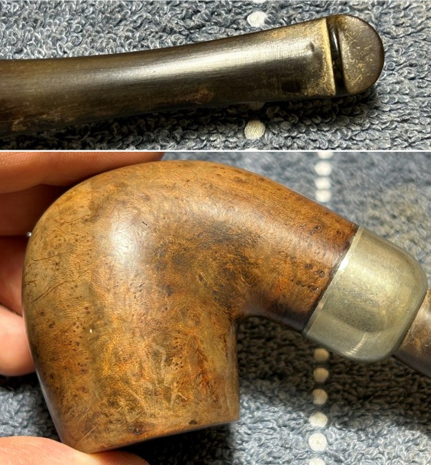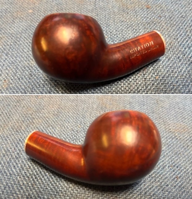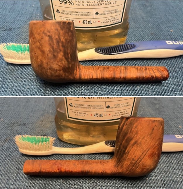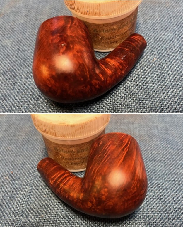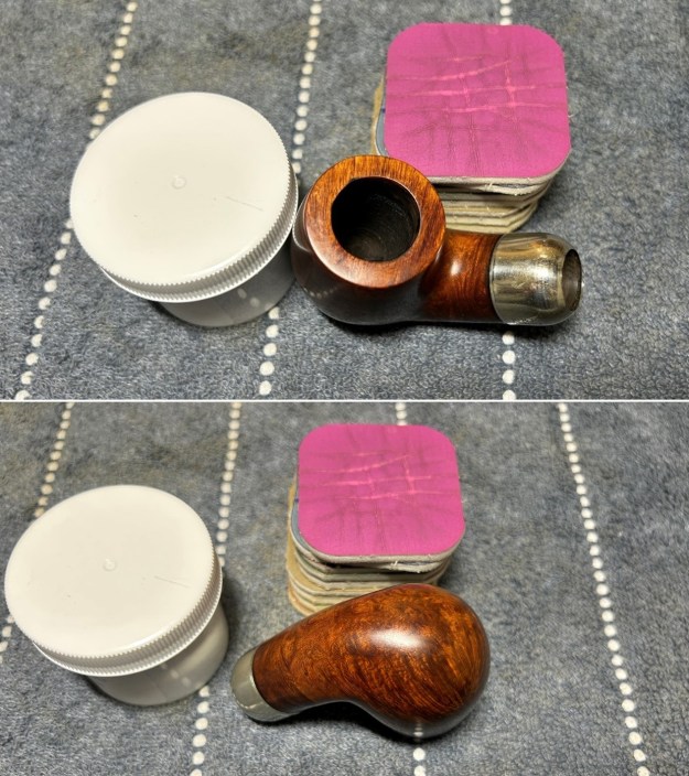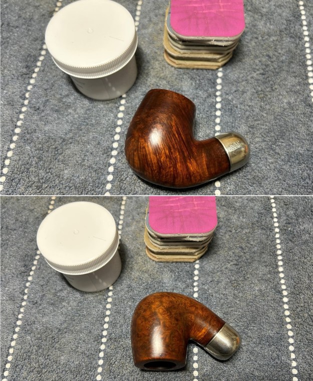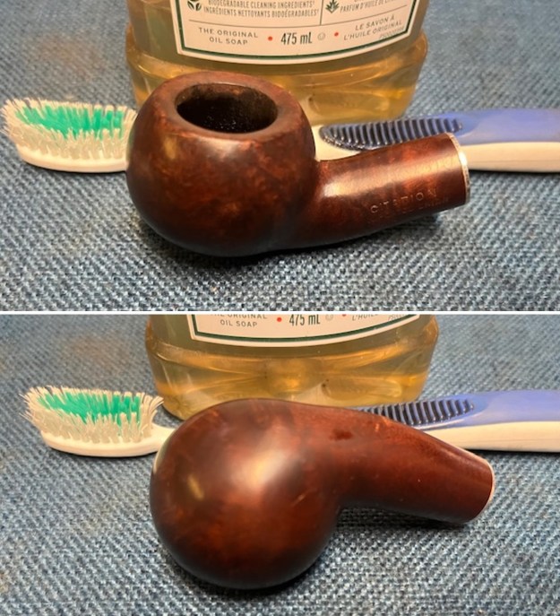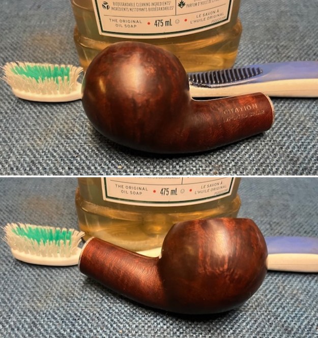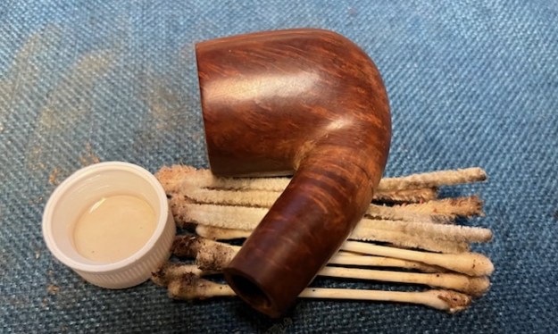 Jeff had done an amazing cleanup of the pipe. He reamed the cake with a PipNet reamer and cleaned up that with a Savinelli Fitsall Pipe Knife. He scrubbed the internals of the bowl and stem with alcohol, cotton swabs and pipe cleaners. He scrubbed the externals with undiluted Murphy’s Oil Soap and rinsed the bowl off with running water. He soaked the stem in Briarville’s Pipe stem Deoxidizer and once it had soaked, rinsed it off with warm water to remove the residual solution. He dried it off and rubbed it down to remove any oxidation that was still on the stem. The pipe looked very good when I received it.