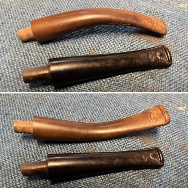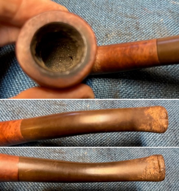 He took photos of the rim top and the stem to show the condition. You can see the thick cake in the bowl and lava, darkening and grime on the rim edge. The photos of the stem show the tooth marks and chatter on the top and underside ahead of the button.