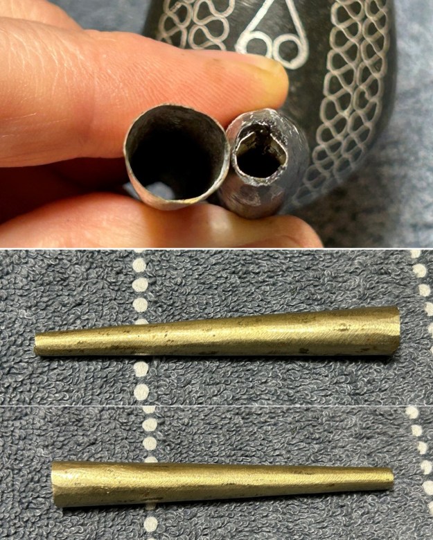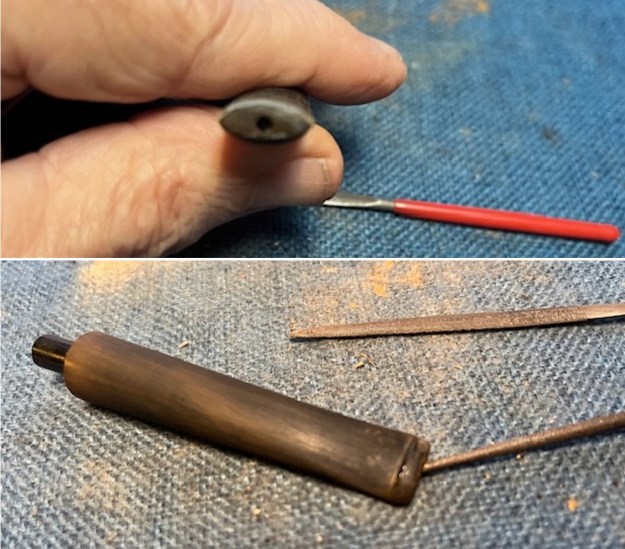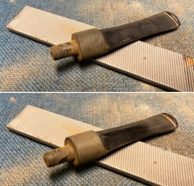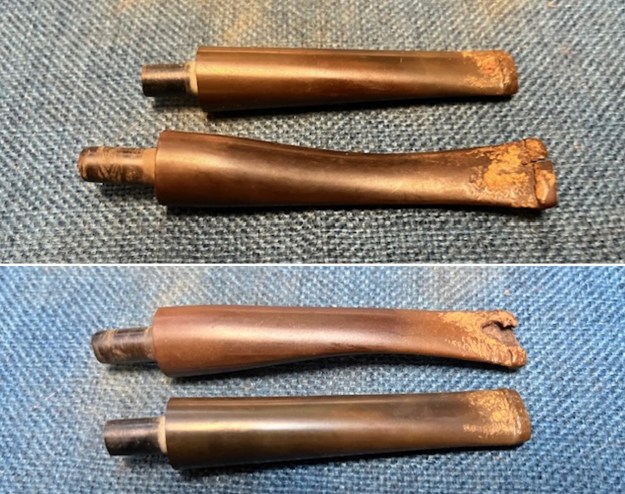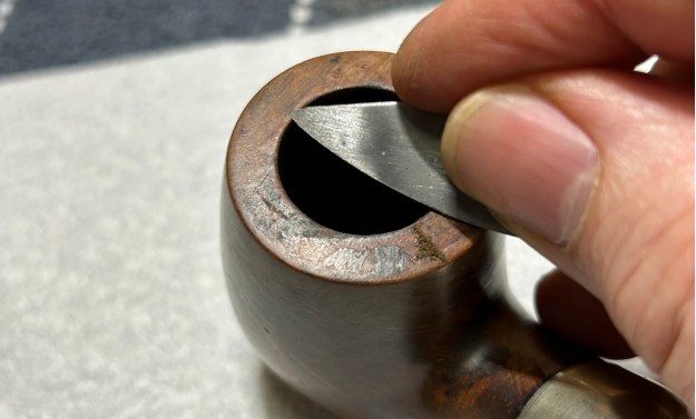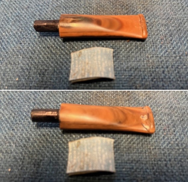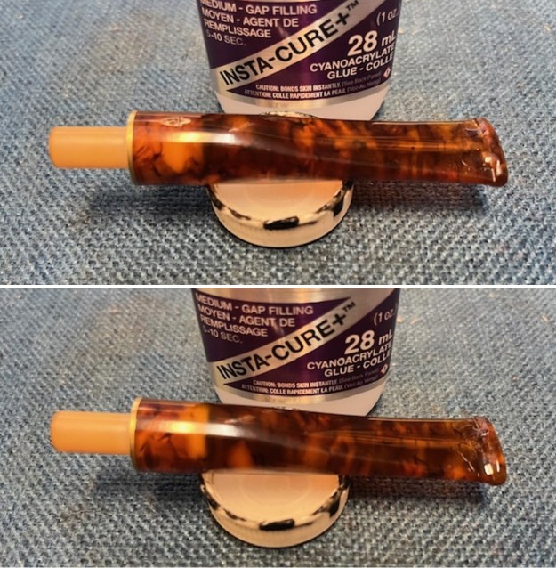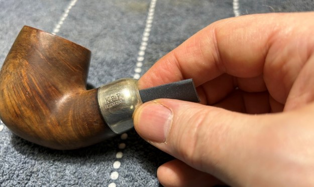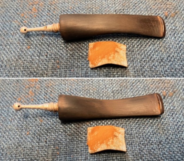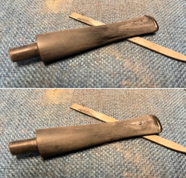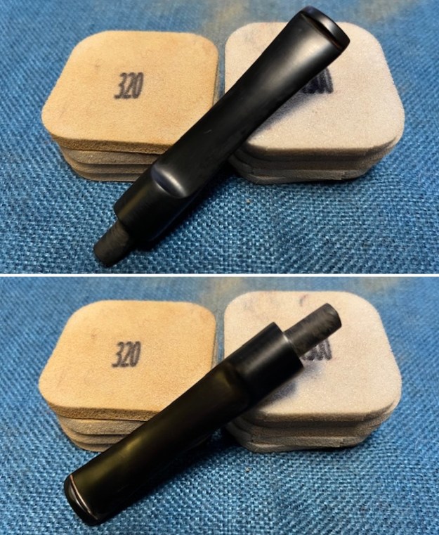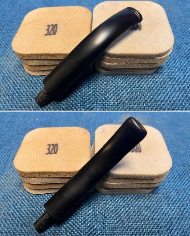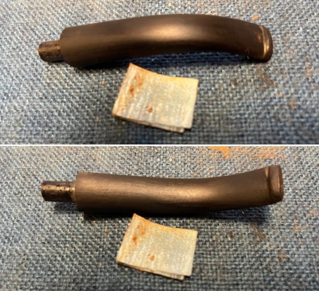 I set the bowl aside and turned my attention to the stem. I “painted” the tooth marks with the flame of a Bic lighter. I was able to lift the majority of them. One remained on both sides ahead of the button. Once the repairs cured I used a small file to smooth them out and recut the button. I sanded repair further with 220 grit sandpaper and blended them into the stem surface.