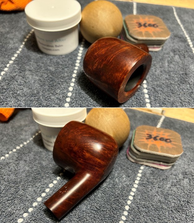 I rubbed the briar down with Before & After Restoration Balm. I worked it into the plateau rim top surface with my fingertips and a shoe brush. The product works to clean, enliven and preserve the briar. I let it sit for 10 minutes then I buffed it with a cotton cloth to deepen the shine. The briar really comes alive with the balm.