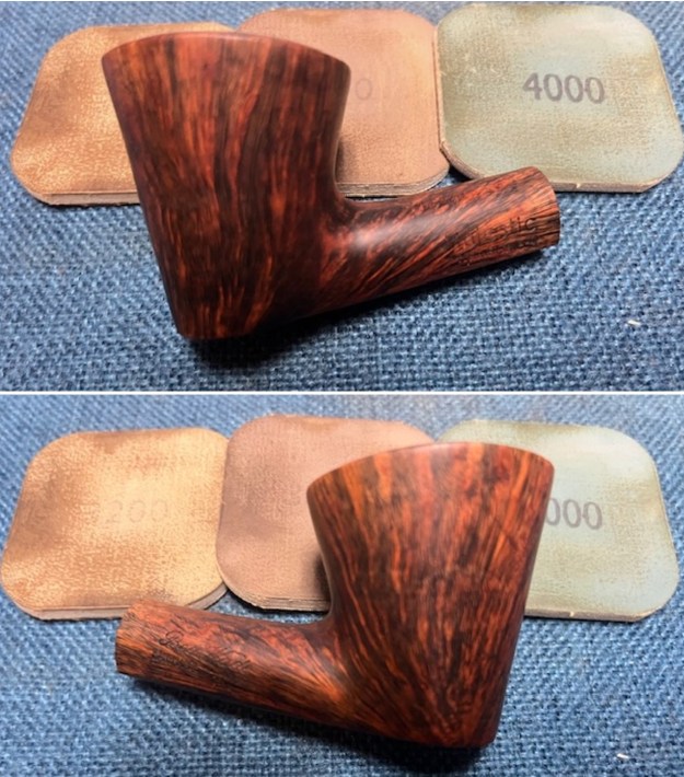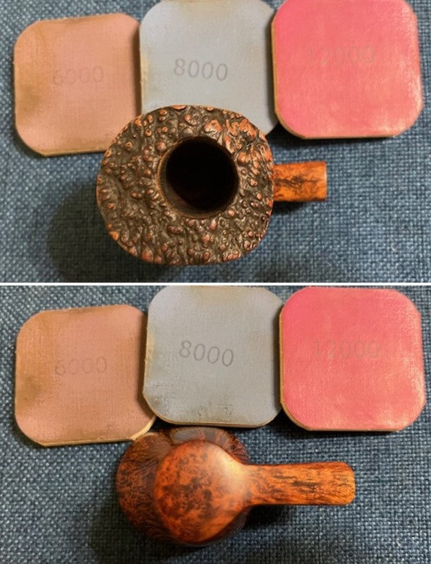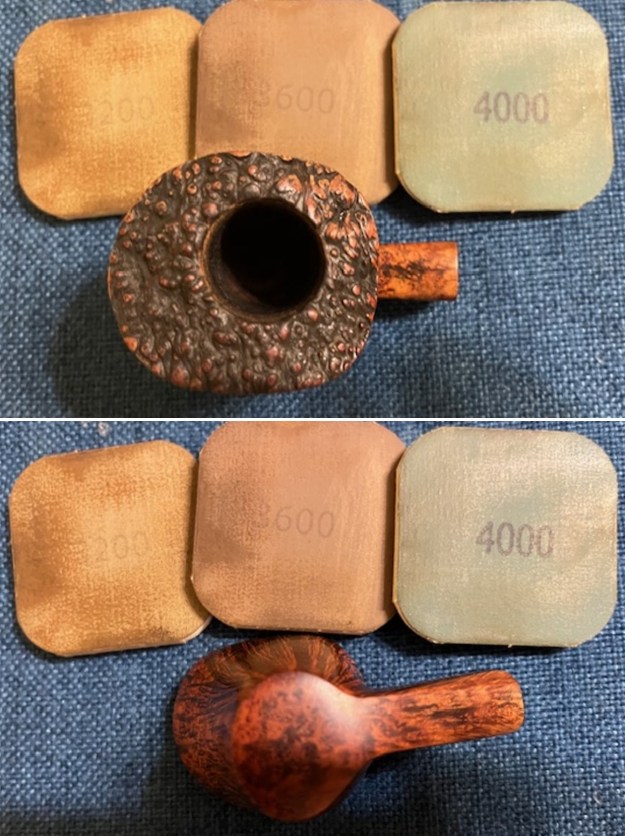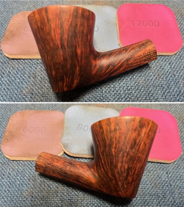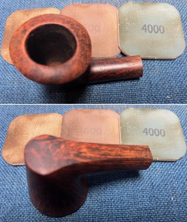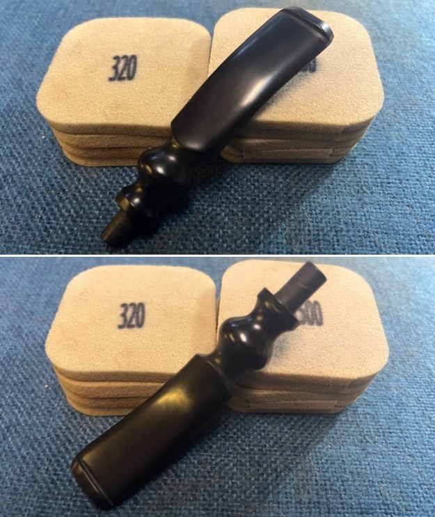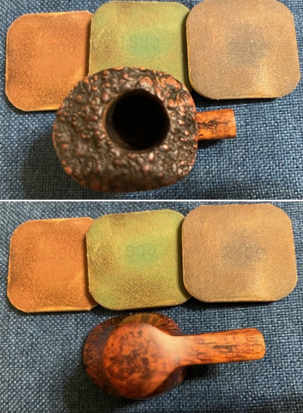 I set the bowl aside and sanded the stem with 320-3500 grit 2 x 2inch sanding pads. I wiped the stem down after each pad with a cloth impregnated with Obsidian Oil. The stem started looking much better by the final pad.