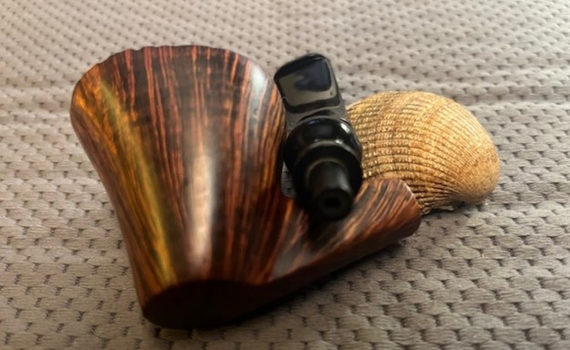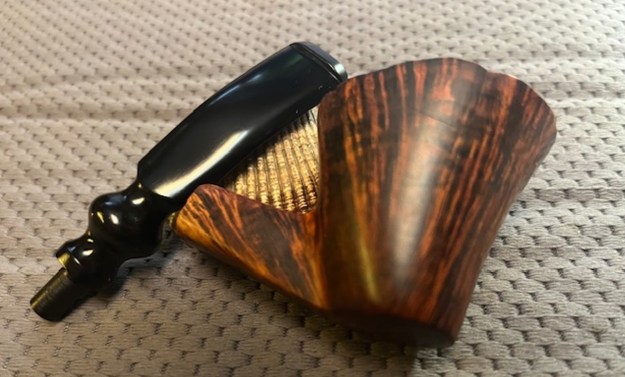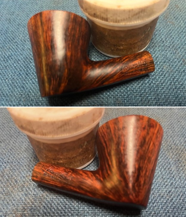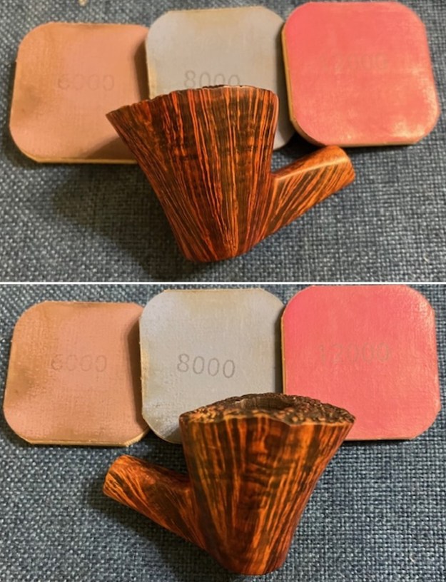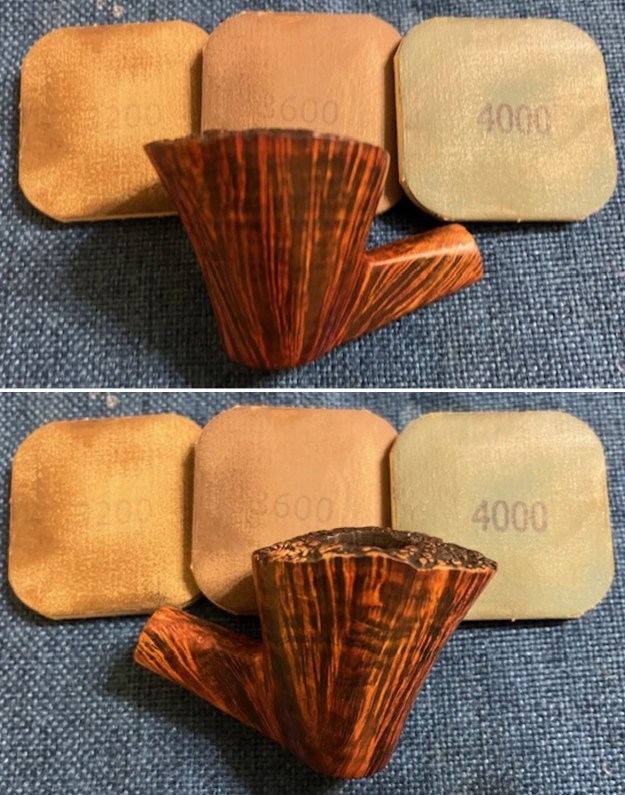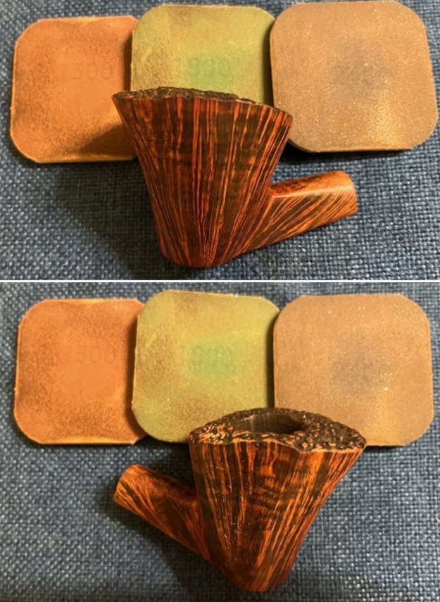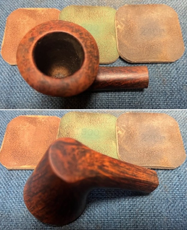 I set the bowl aside and sanded the stem with 320-3500 grit 2 x 2inch sanding pads. I wiped the stem down after each pad with a cloth impregnated with Obsidian Oil. The stem started looking much better by the final pad.