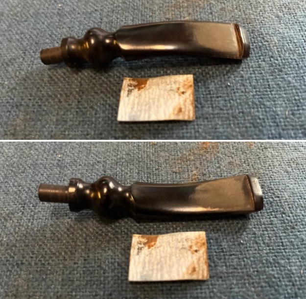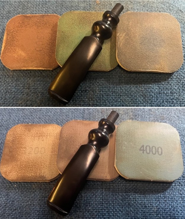 I touched up the faint “N” stamp on the top of the stem with white acrylic nail polish. I let it cure and then scraped off the excess and then move on to sand it with a worn 320 grit sanding pad.