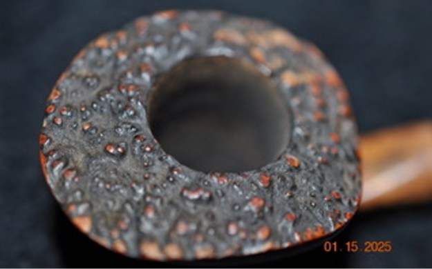 Jeff took photos of the bowl and rim top to show the thick cake in the bowl and the heavy lava and burn damage on the smooth rim top and inner edge of the bowl. He took photos of the top and underside of the stem showing the light oxidation and the light tooth marks or chatter. It is a pretty clean looking stem.