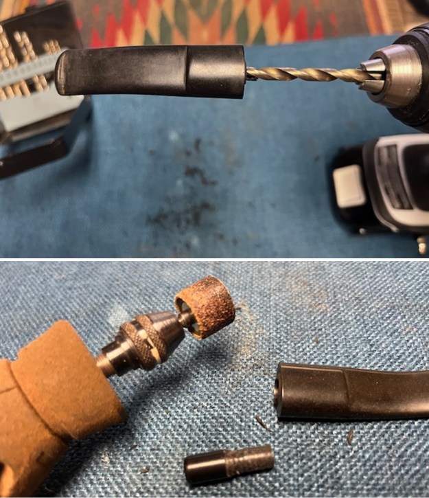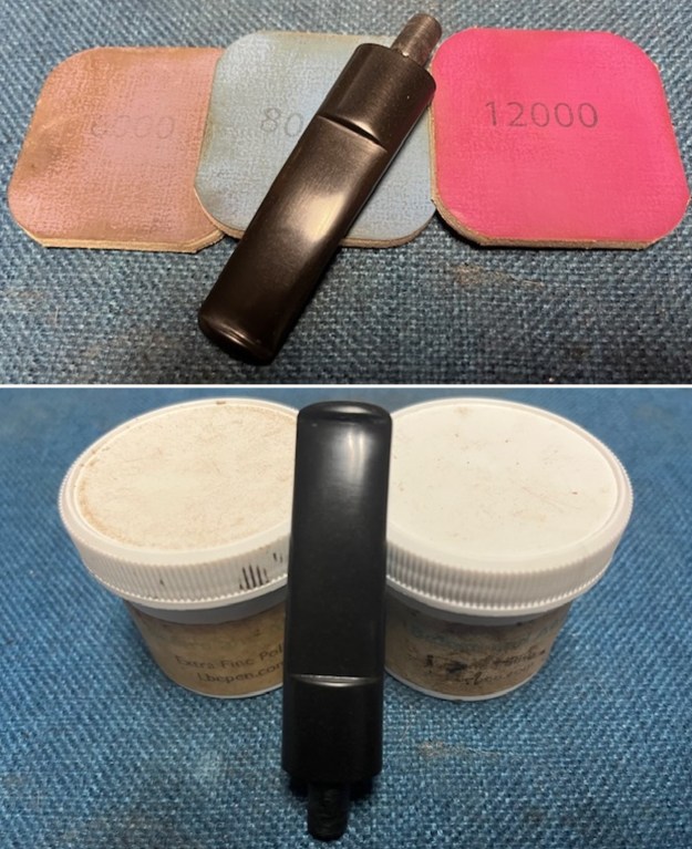 I sanded the stem with 320-3500 grit sanding pads to remove the tooth marks and chatter against the button edge. I wiped the stem down between pads with an Obsidian Oil cloth to remove the sanding debris from the stem.