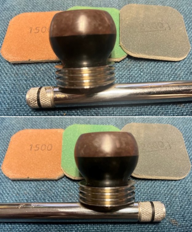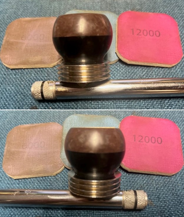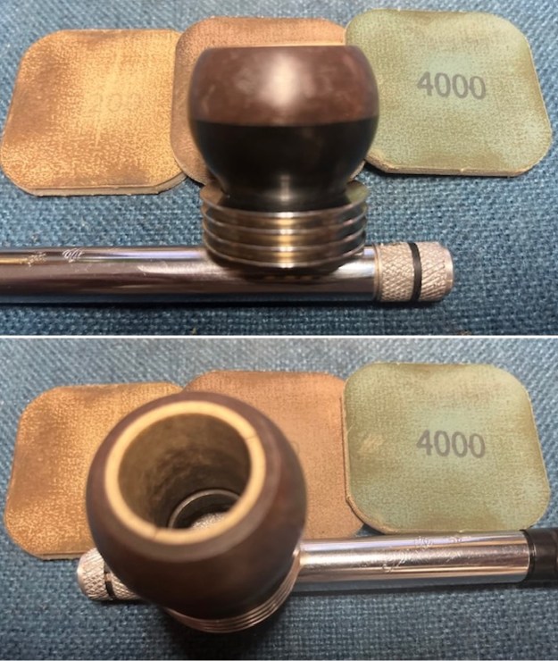 I sanded the briar with 320-3500 grit 2×2 inch sanding pads. I wiped the bowl down after each sanding pad to remove the sanding debris. It really looks much better.