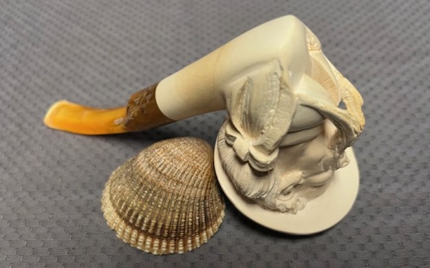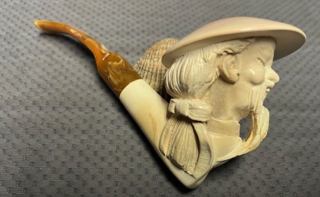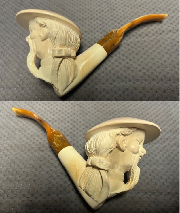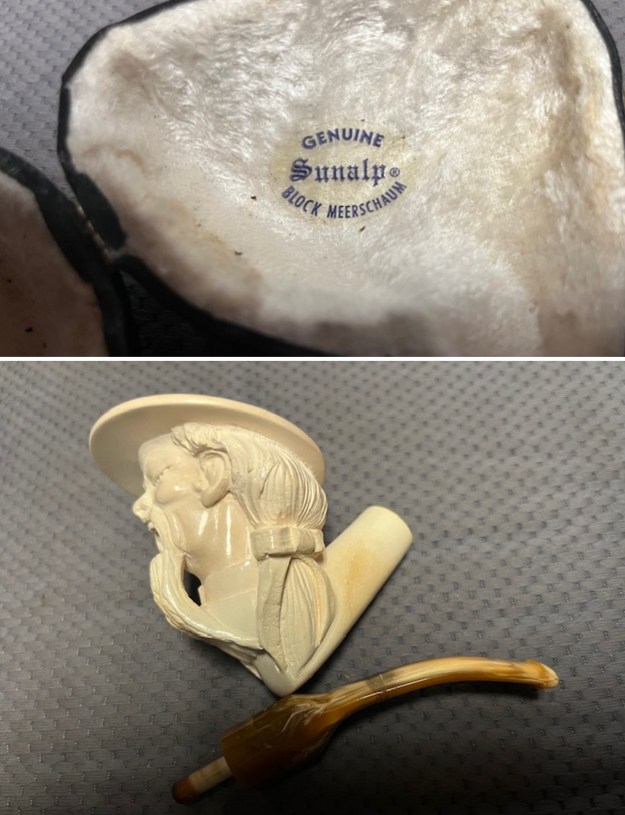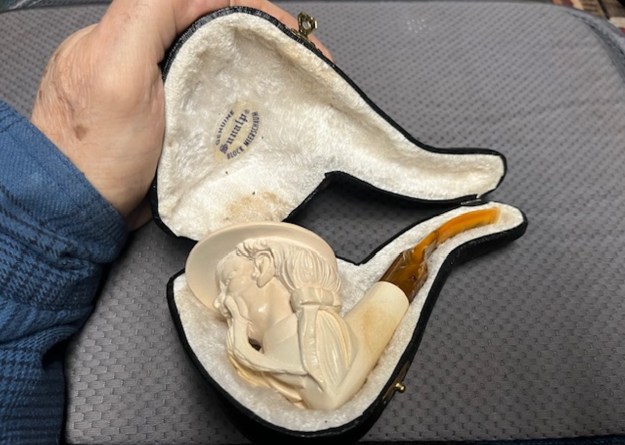 The next pipe on the table is another one that came to us from the seller in Caldwell, Idaho, USA on 07/12/2025. It is a nicely carved Block Meerschaum Figural with a variegated gold/brown acrylic saddle stem. It is in a black leatherette covered case with a cream velour liner. It is in slightly dirty but in good condition as can be seen in the photos below. There is no stamping on the stem or shank. The inside of the case has two stickers – one on the inside of the cream coloured velour lined case that reads Genuine [arched over] Sunalp [underneath it arched] Block Meerschaum. The second sticker reads Sunalp [over] Turkey.
