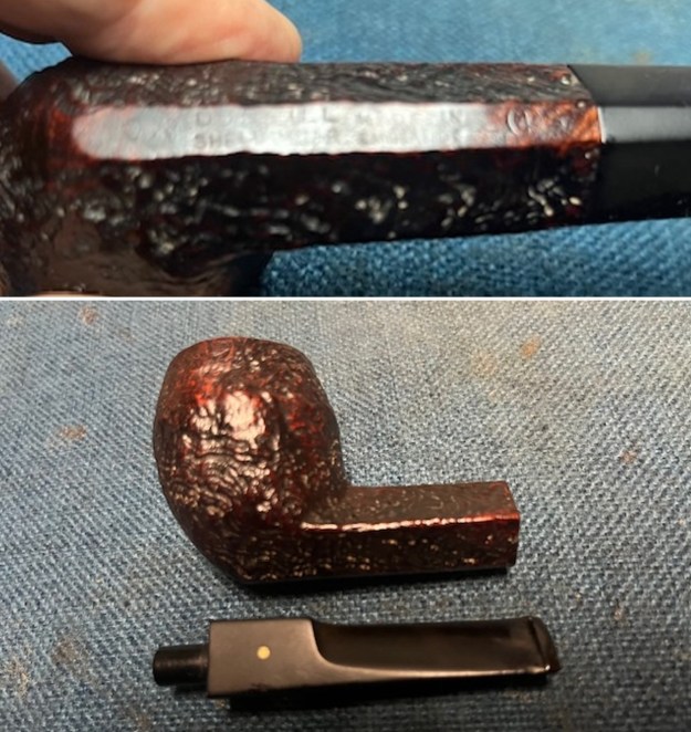 The next pipe on the table came to us from a seller in Cleveland, Ohio, USA on 04/26/2022. It is a Dunhill Shell Briar Bulldog with a saddle stem that has been “ridden hard”. It is in rough shape as can be seen in the photos below. It is stamped on a smooth panel on the underside of the shank. On the heel of the bowl it is stamped with the shape number OX followed by Dunhill [over] Shell Briar [followed by] Made in [over] England6 [followed by] Circle 4T. The stamping is faint in spots but still readable. The pipe has a mix of black, cordovan and brown stains on a Shell sandblast finish and some amazing grain that the shape follows well. The finish was dusty and dirty with grime ground into the nooks and crannies of the rugged sandblast. The bowl had a thick cake and there was heavy lava in the sandblasted rim top and edges. The original stem is on the pipe and it is a mess. The button has a crack on the top side and the underside is missing a huge chunk from the button forward about ¾ of an inch or more. Jeff took photos of the pipe to show what it looked like before he started working on it.