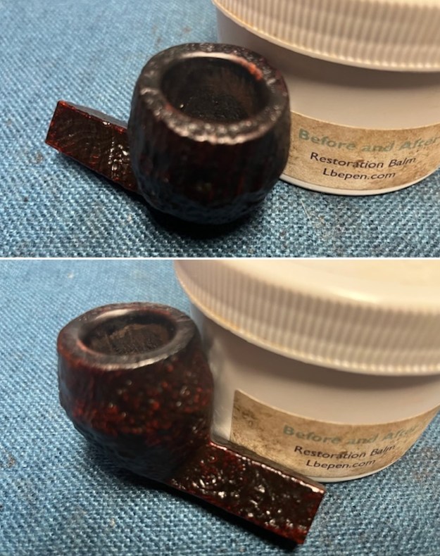 I rubbed the briar down with Before & After Restoration Balm. I worked it into the briar with my fingertips and a horsehair shoe brush to work it into the nooks and crannies of the sandblast finish. The product works to clean, enliven and preserve the briar. I let it sit for 10 minutes then I buffed it with a cotton cloth to deepen the shine. The briar really comes alive with the balm.