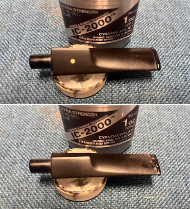 I rebuilt the new button on both sides with the Extra Strength Rubberized/Carbon Black CA glue. I layered it on the stem surface and repeated the process until the stem was workable. I let the repair cure overnight. Once it cured I shaped and flattened it with a small file.