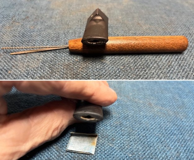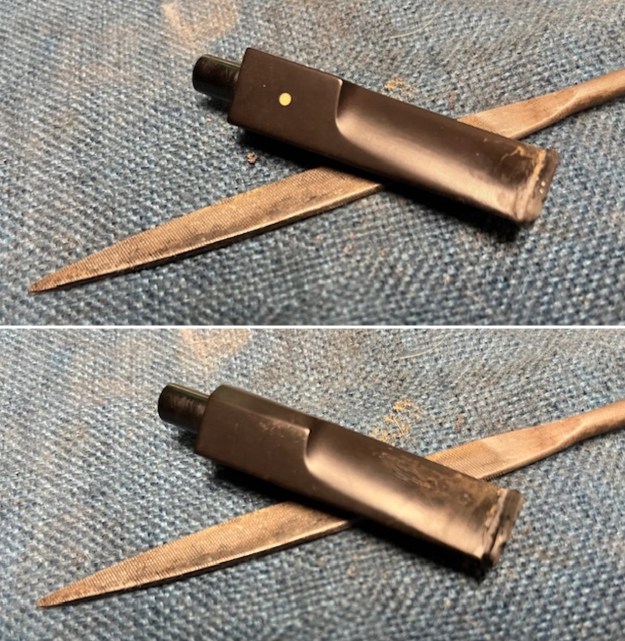 I tried filling in the chipped area on the stem surface with Black CA Glue, carefully layering it on the surface. When it dried, it also cracked fell out. I tried another repair with a piece of mesh like Kenneth described in his blog on the stem repair. Once it cured it too cracked along the remaining edges of the stem and fell out. There was nothing I could add to strengthen the repair. With the various avenues of repair unsuccessful I decided to cut off the damaged stem end. I did it with a Dremel and sanding drum and removed all of the damaged area on the stem.