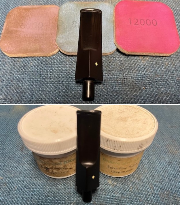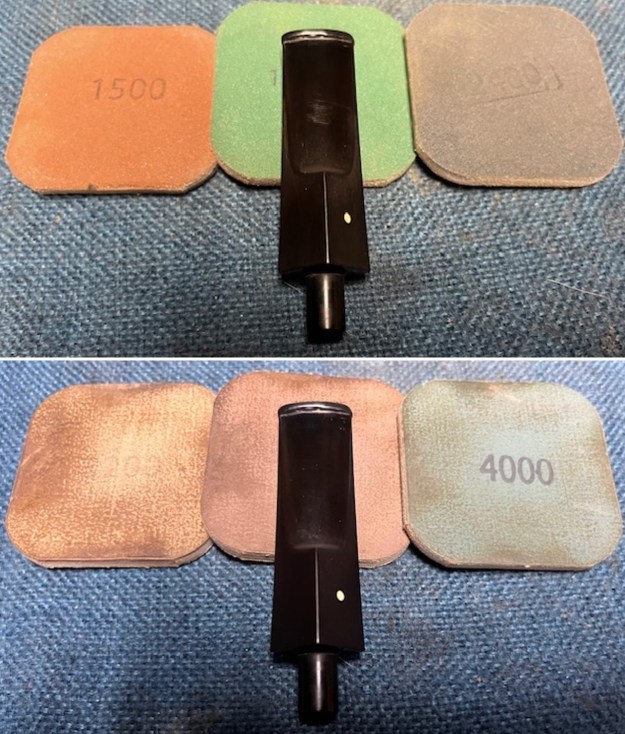 I sanded the stem and tenon surface with 320-3500 grit 2×2 inch pads. I wiped the stem down with an Obsidian Oil cloth after each sanding pad.