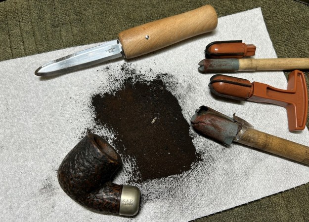 On to the stummel – this is where the lion’s share of the work was. The insides (both bowl and shank) were overwhelmed with cake and tar and anything else you’d care to mention. The bowl really needed to be reamed, so I used a reamer to scrape off as much built-up cake as possible. Generally, I prefer to sand the chamber down to bare briar. When restoring, it is important to ensure that there is no damage to the briar under the cake. There are a few situations when I might leave some cake in the bowl, but not today. There were definitely some craze lines in the interior walls of the briar. I’ll come back to that later.
