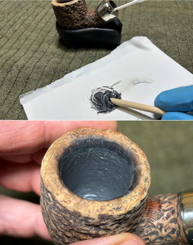 I now wanted to address the heat crazes inside the bowl. I prepared some heat-resistant epoxy and filled the cracks and gouges, ensuring that the epoxy was thinly and evenly spread throughout the bowl. Of course, I did plug the draught hole with a folded pipe cleaner (coated in petroleum jelly) to make sure none of the epoxy made its way up there. Once done, a good 24 hours was needed to ensure that the epoxy was properly cured. The next day, I roughened up the epoxy’s surface with 220-grit sandpaper for the next step. I thinly coated the inside of the bowl with a mixture of my wife’s homemade yogurt and activated charcoal. Once hardened, this provided a good, faintly rough surface for a new cake to build.