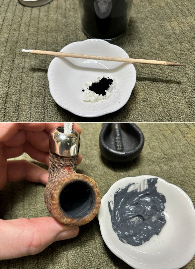 Just like the bowl, the shank was absolutely disgusting. It had never been cleaned – or, not for many decades. I started cleaning the inside with isopropyl alcohol, cotton swabs, and pipe cleaners. This took a while. The inside was very dirty and required an extraordinary number of cotton swabs and pipe cleaners. Eventually some cleanliness came to it.