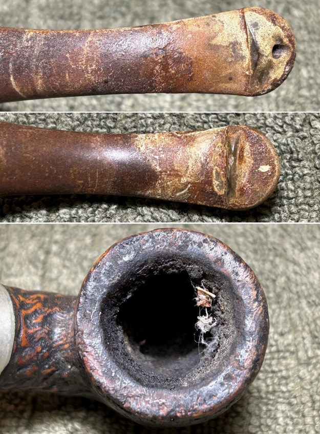 This pipe is filthy beyond description – but must have been smoked frequently and with great affection. The stem has dirt everywhere, severe toothmarks aplenty, and calcification as I have seldom seen. Meanwhile, the stummel looks as though dirt has been ground into the grooves of the rustication. The rim is coated in lava and the bowl is clogged with cake. The old fellow must have really loved his pipe.