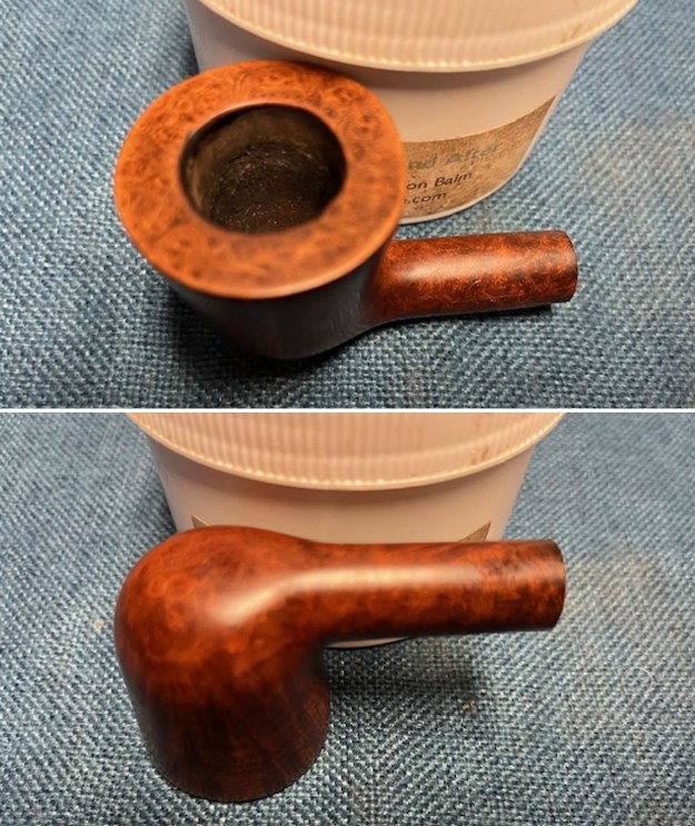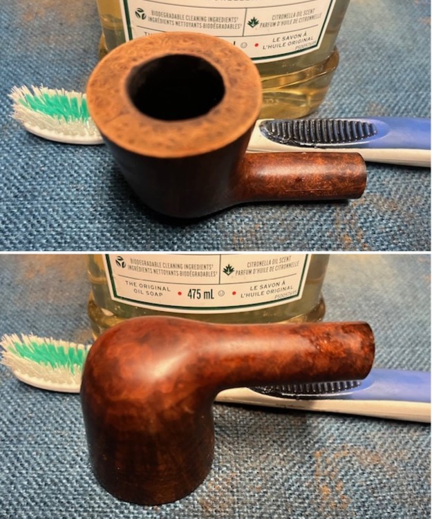 I scrubbed the bowl and shank with a tooth brush and some undiluted Murphy’s Oil Soap. I rinsed it off with warm water to remove the dust and soap from the finish. I dried it off with a soft cloth and it looked much better.