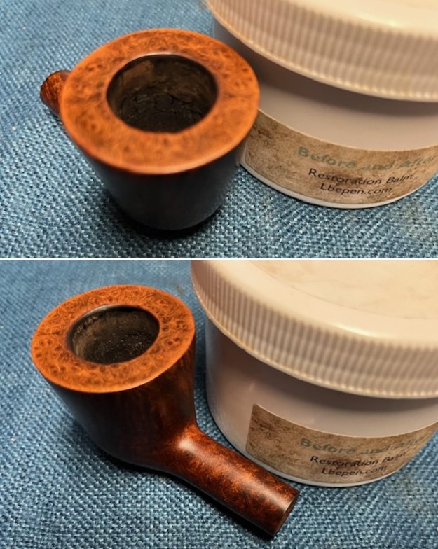 I rubbed the briar down with Before & After Restoration Balm. I worked it into the briar with my fingertips to work it into the finish. The product works to clean, enliven and preserve the briar. I let it sit for 10 minutes then I buffed it with a cotton cloth to deepen the shine. The briar really comes alive with the balm.