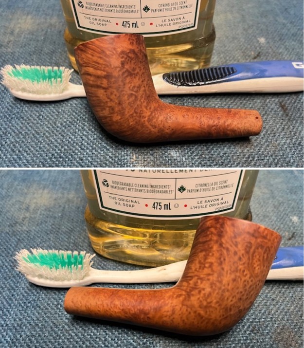 I scrubbed the bowl and shank with a tooth brush and some undiluted Murphy’s Oil Soap. I rinsed it off with warm water to remove the dust and soap from the finish. I dried it off with a soft cloth and it looked much better.