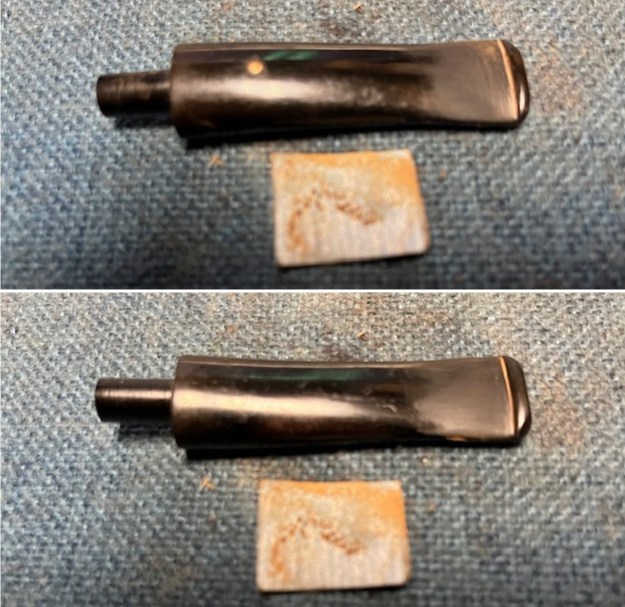 From the above information I could see that I was working on a Root Briar 83F/T Zulu shaped pipe. The EX gives another exciting bit of information that the pipe was given to the owner as a replacement or exchange for a broken pipe still under guarantee.