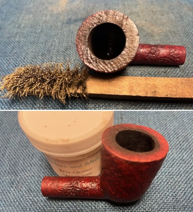 I worked on the darkening on the rim top with a brass bristle wire brush and some Before & After Briar Cleaner. I worked it into the grooves on rim top sandblast and let it sit for 5 minutes. I repeated the process four times and when finished I wiped it off. I was able to remove the majority of the darkening with this method.